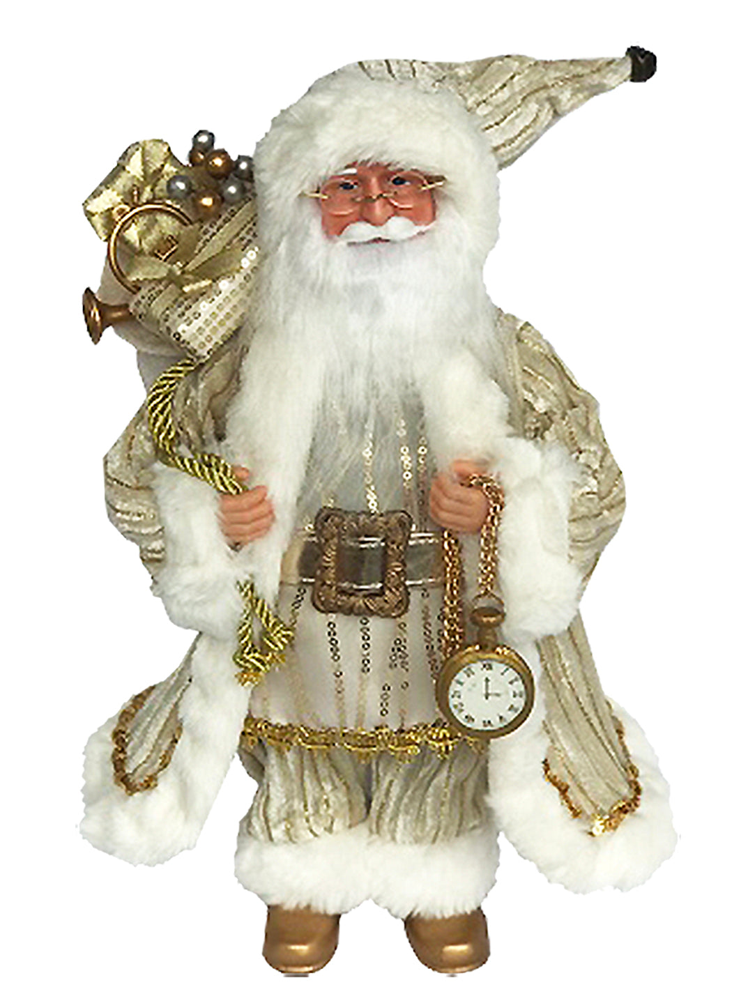 Toss out that old red suit because Santa is taking it up a notch! Santa's new look features a gold patterned jacket and hat with soft white faux fur trim and complementary shiny gold boots. He carries a gold pocket watch in one hand and some stylish presents and holiday decorations in the other. With head, hands and boots molded from sturdy resin, this wonderful 15" Trimmed in Gold Claus will bring fun and delight for many seasons to come.