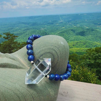 Double pointed quartz crystal and natural stones - Lapis, labradorite, fluorite, amethyst, black obsidian. Feel the positive vibrations of these stones. Quartz crystal is a cleansing stone and helps magnify the vibrations of the stones with which it’s paired. Adjusts to fit everyone. Double pointed crystal is about 1-2 inches long. Due to the organic nature of the stones colors and sizes may vary slightly from those pictured. Each stone is individually hand knotted.