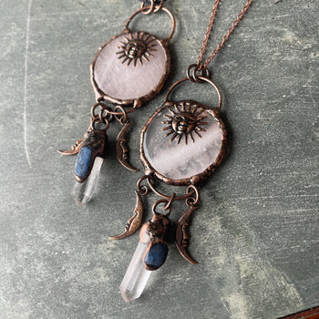 This magnificent necklace honors the sun and moon with rose quartz and kyanite. 20 inch antique copper chain. Pendant is about 2” wide and 4” long. Because natural stones are used in this design the actual piece you receive may vary slightly from those pictured but will be just as magnificent. Perfectly complimented with our copper rose quartz statement ring.