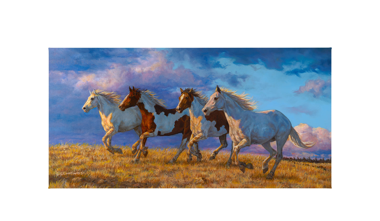 Galloping into the sun at the crest of a hill, the horses enjoy their freedom to gallop across the golden fields, leaving the distant trees and valley behind them.