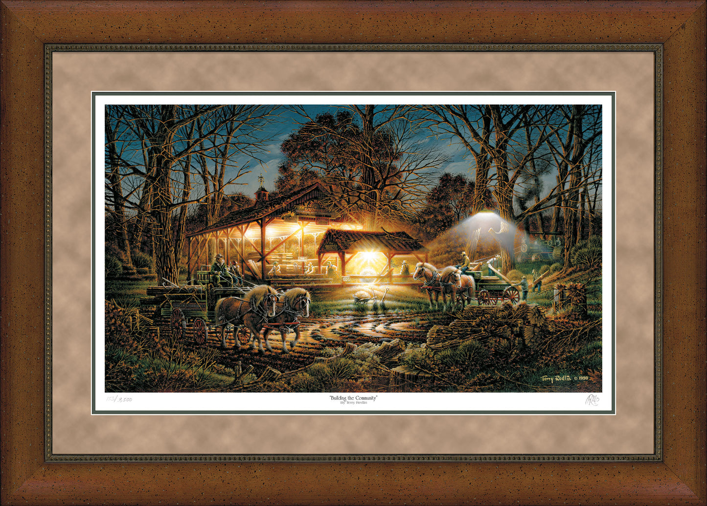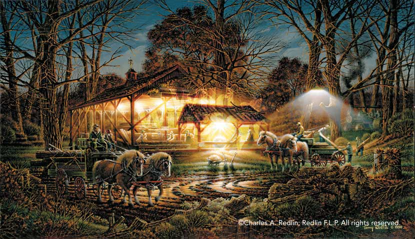 “As the whirling blade's sharp sound cuts through the forest night, Terry Redlin invites us to revisit an earlier era in America's past. Deep in the woods felled trees are gathered and slowly hauled to the sawmill. An old steam tractor rattles and groans, puffing out its power. The raw-cut lumber piles higher and higher in the open shed. It will be stored here to cure for a while, then delivered to waiting lumberyards in nearby towns. 'The painting was a challenge,' the artist comments, 'because I needed to combine several sources of light. Hopefully the eye moves easily from one area of bustling activity to another.'”