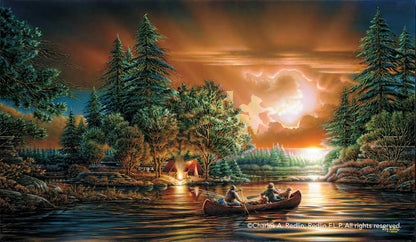 “Several campers have already reached Rendezvous Point and set up camp. Now, at sundown, before a dramatic sky of developing thunderheads and bursting light, the rest of the family members quietly glide toward their destination. We note the young girl in the canoe carefully trails a line and bobber. The family dog, not fully at ease in the rocking canoe, is anxious to reach land. The campsite is ready for visitors, with camp table and benches in place.”