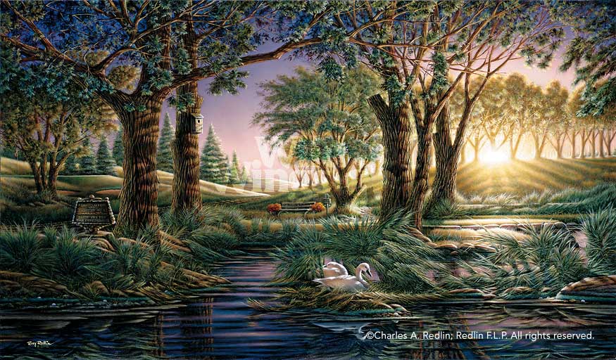 “In this, the third image in Terry Redlin’s ‘On the Greens’ series, the artist illustrates how wildlife and man can coexist in close proximity. As dawn breaks, golfers on the far green begin their game while the swans in the conservation area peacefully settle on their nests. Only the errant golf balls in the stream indicate that the two groups sometimes interrupt each other’s day.”