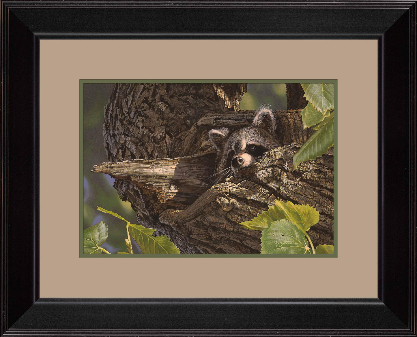 Open edition art print made from the original acrylic painting depicting a raccoon peeking out of a hole in a tree. Prints are signed by the artist. Image size, 11" x 16". Framed size 22" x 26" with a 2-1/2" black-finished moulding. Double matting with tawny outer mat.