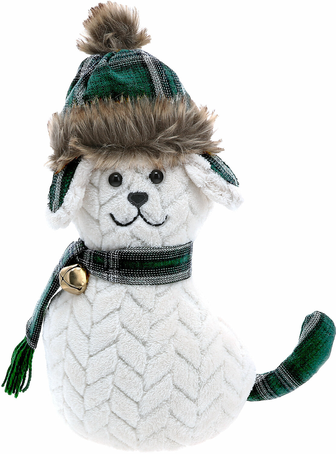 The dog has a black embroidered face, a felt gray nose, and plastic black and gray eyes. The fluffy brown fur-trimmed winter hat sits on the dog's head. The collar features a gold metal bell. Meanwhile, the green plaid details and debossed white chevron patterns are made from 100% polyester. The interior has fluffing, weighted beads, and a felt bottom to protect floors and hardwood surfaces. This holiday winter-centric piece will brighten Christmas spirits with its happy, smiling face. It's packaged in a plastic polybag with a hang tag. The sewn-in logo tag is placed on the backside of the stack. Weighing approximately 1.25 pounds, this door stopper can hold open lightweight wooden doors; it is not meant for holding open spring-loaded or heavyweight doors. . Spot clean only. Sundry. Keep out of reach of children and pets. Wonderful for pet parents of a snuggly K9 doggy puppy dog adopted friend. Dog moms/dads will be excited to display this winter wonderland item throughout the season.