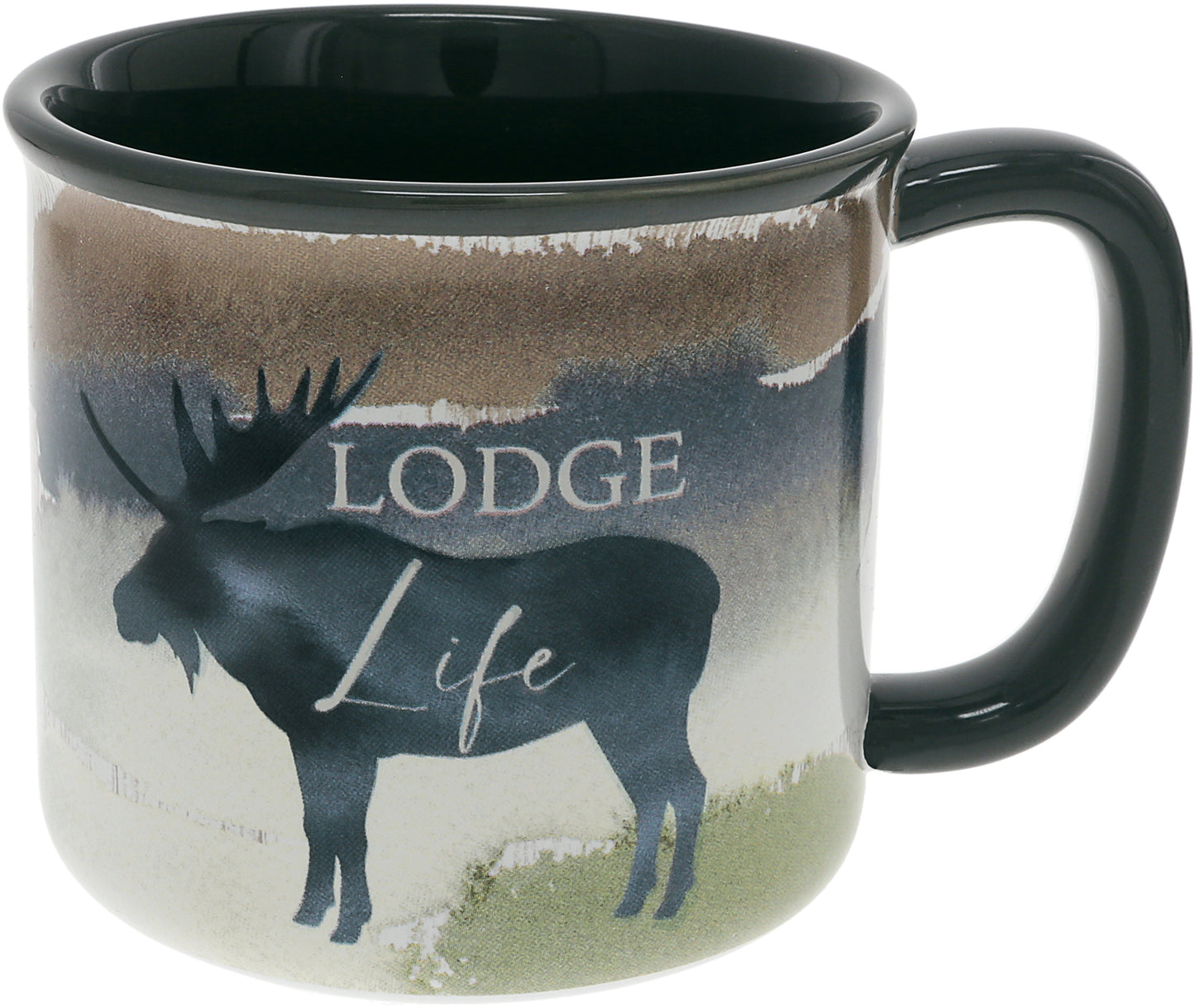 17 oz stoneware coffee cup mug measures 5.5" long x 4" wide x 3.75" tall. Large easy-to-hold rounded edge handle - flat top and bottom for comfortable thumb resting—glossy finished interior & exterior. Tapered easy-to-sip lip construct with straight-edged sides. Cream wood-printed wrap design wraps around the entirety of the vessel. In contrast, the front side has a gray, green, beige, and blue watercolor finish with a gray moose accompanied by a "Lodge Life" sentiment. The handle and interior of the mug is gray. Dishwasher & microwave safe. They are packaged securely in a die-cut box for safe shipping. These rustic lodge-themed cool-toned patterns complement the decor of any woodsy cabin kitchen or dining room. Memories at the lodge are immaculate, including activities of hiking, canoeing, kayaking, fishing, biking, or snuggling up by the fire with loved ones.