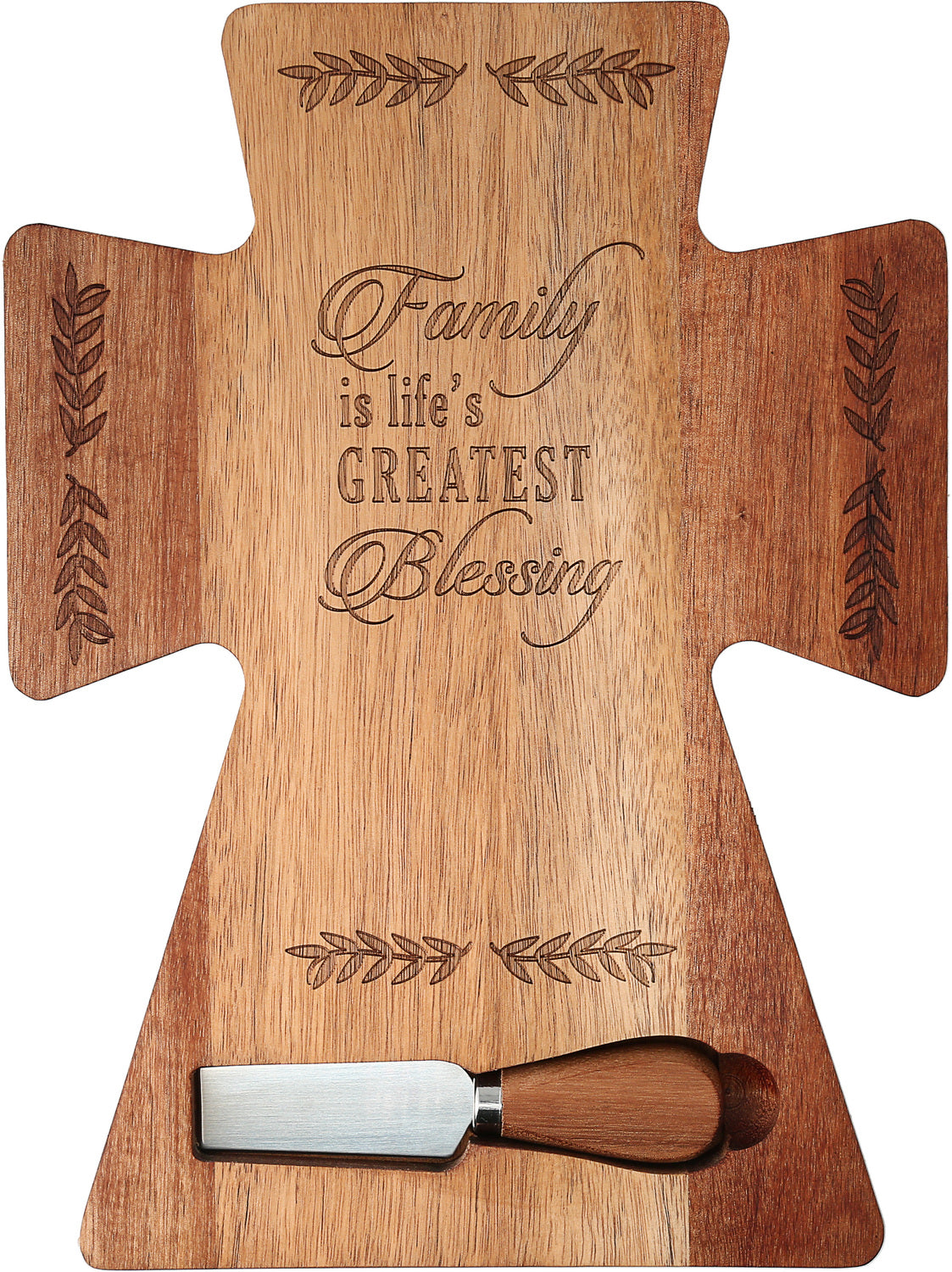 The Pavilion Family Is Life's Greatest Blessing serving board is crafted with premium-quality acacia wood, measuring 12" long x 8.75" wide and 1" tall, accompanied by a zinc alloy stainless steel cutter/spreader with an acacia wood handle, all elegantly packaged in an acetate and cardboard box. Each cross-shaped woodblock boasts a unique grain pattern, with the sentiment "Family Is Life's Greatest Blessing" and a bordered greenery pattern laser engraved on the front. While the plain backside is suitable for use as a cutting board, the front side serves as an ideal platform for serving guests. This piece makes a thoughtful gift for religious God/Jesus church friends and wine enthusiasts, especially when paired with their favorite wine. Care instructions include hand-washing with light soap, seasoning with food-grade mineral oil, and reserving the backside for cutting fruits, vegetables, and cheese exclusively.