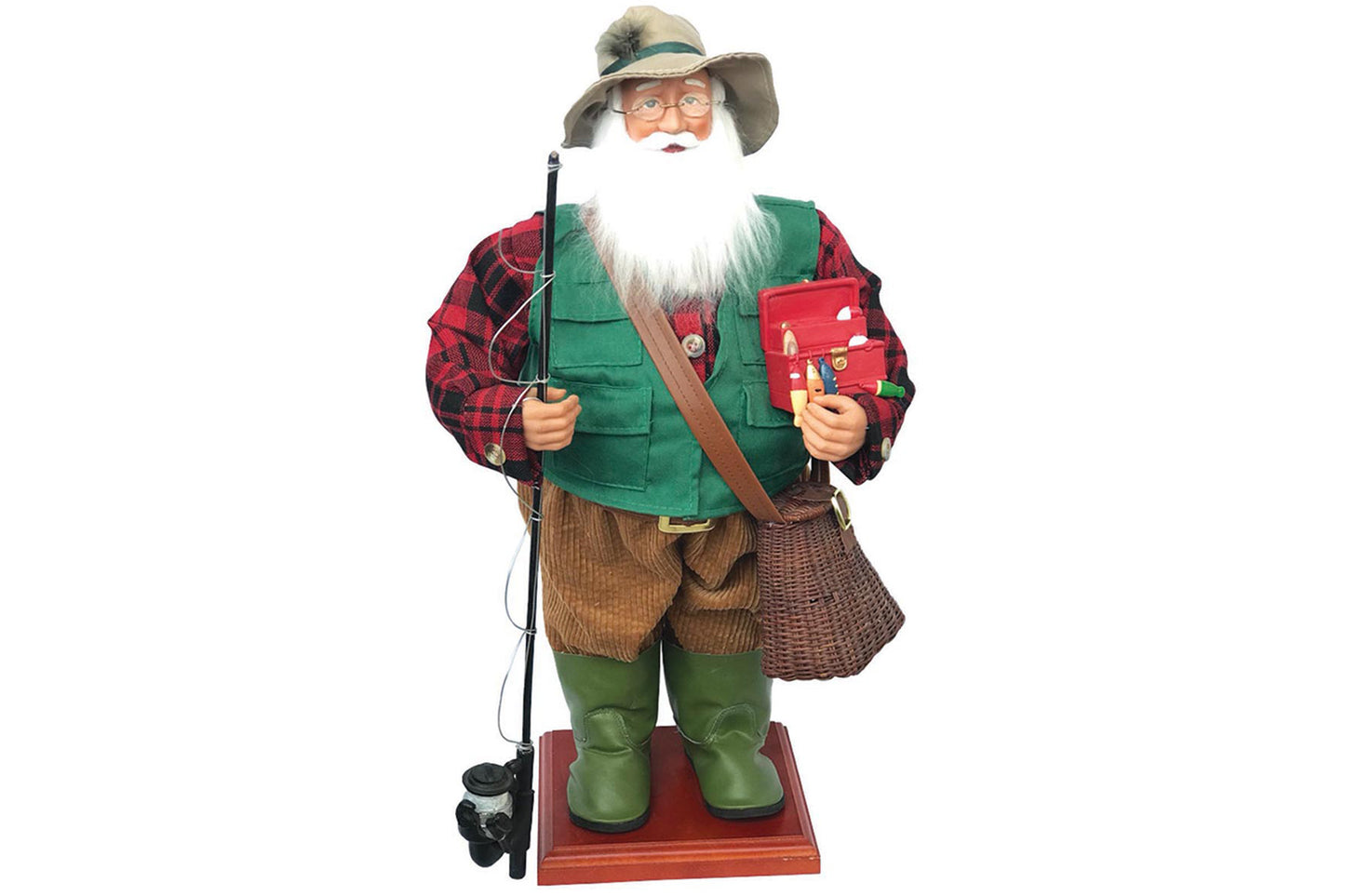 Santa is capable of some amazing things, but even he can't make the fish bite! It's another beautiful day on the river, and Santa is trying out some new topwater plugs the elves made him for Christmas. Dressed in brown corduroy pants, wading boots and a green fishing vest with working pockets, Santa casts and hopes he'll be able to put at least one fish in his new natural fiber fishing creel. Crafted with a real wood base for added stability when displaying. Experience the excitement of the Christmas holiday with this elegantly handcrafted 24" Grandpa Fishing Claus figurine.