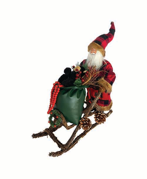 When Santa has toys to deliver in the remote North woods, he leaves the reindeer at home and takes his mushing sled instead! On this trip, Santa has brought along a big bag of gifts with a little baby bear snuggled in on top. Crafted from natural wood fibers, Santa's backwoods sled has sturdy wooden runners and is decorated with a green wreath and pine cones. Make your holiday season one to remember with this wonderfully handcrafted and hand painted 20" Buffalo Plaid Sled Santa.