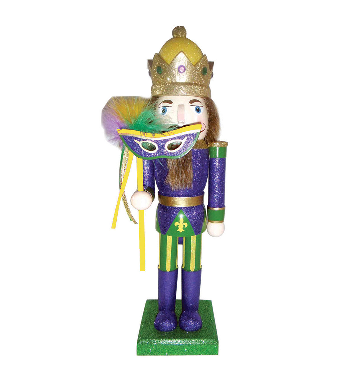 Nothing captures the festivity and fun of Mardi Gras like the representative colors: purple for justice, gold for power and green for faith. This beautiful Mardi Gras Nutcracker wears his king's crown proudly and is adorned with a multitude of gems and beads to capture the magic of the holiday. Put a little Fat Tuesday into your celebrations this year with this wonderfully handcrafted and hand painted 14" Mardi Gras King Nutcracker.