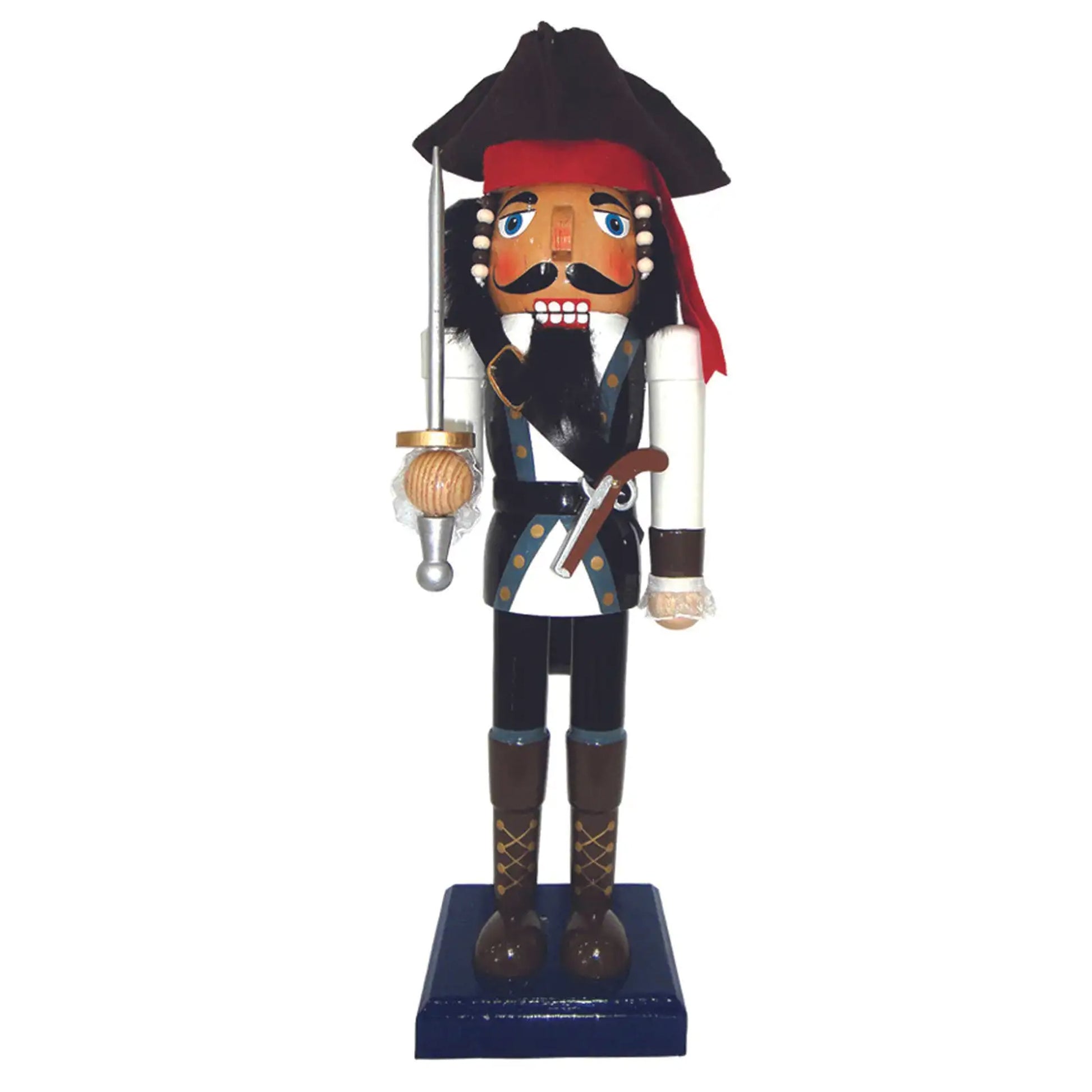 This 14" nutcracker is great for a collector. He is Johnny Pirate and adorable. He is wearing his black pirate hat with the red band around his forehead. He has a hand painted vest and boots. To make his look complete he is holding a sword and has a holster holding his pistol. He stands on a square base.