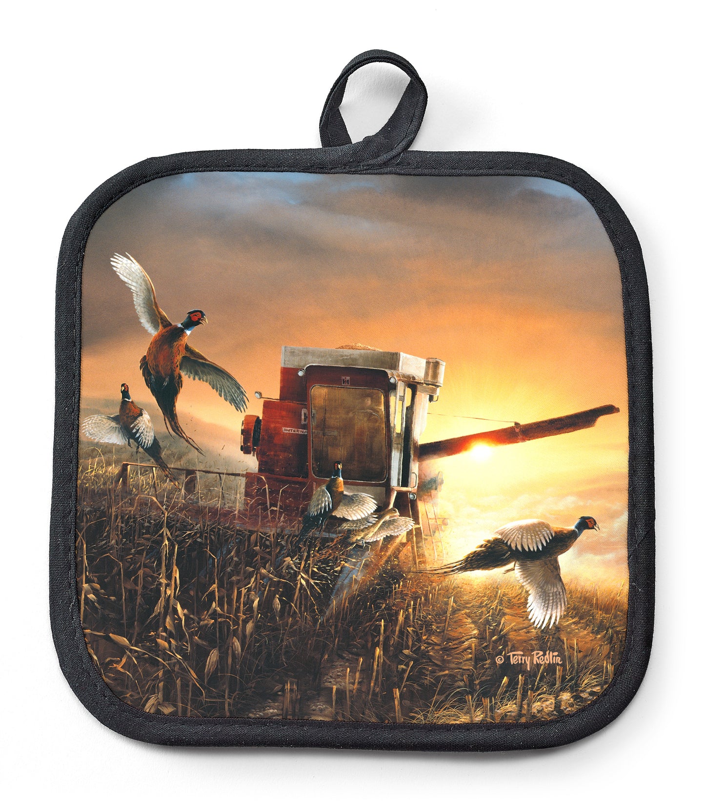 Mix in a dash of nature with our kitchen essentials. Beautiful wildlife images and scenes are printed, and heat cured for bold, high quality, and long-lasting wear. Black accent piping. Quilted backing. 50/50 cotton/poly blend. Machine washable. Designed and printed in the USA. 8" square.