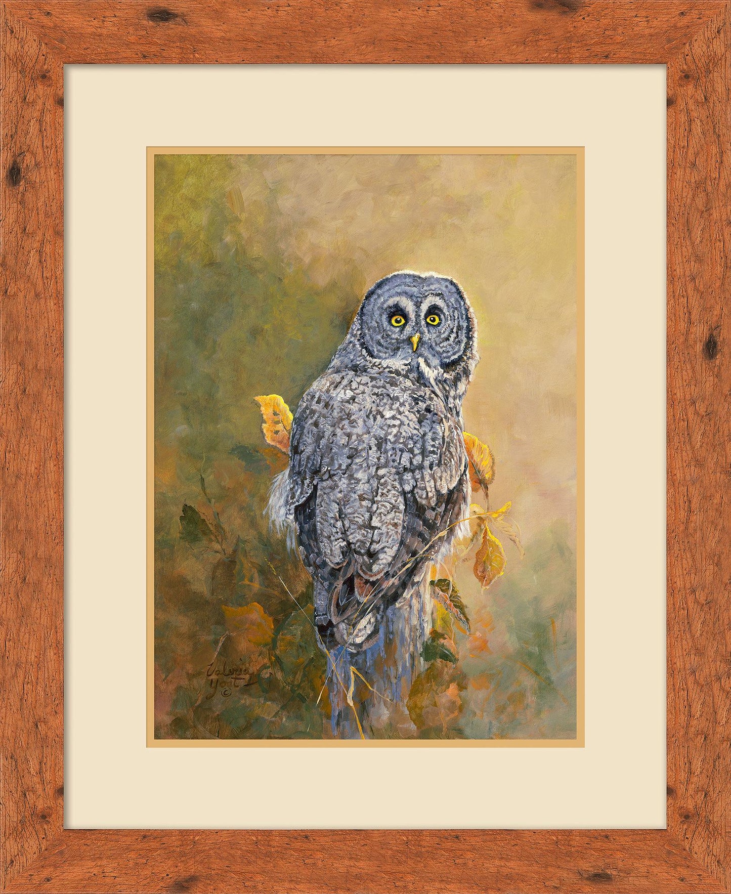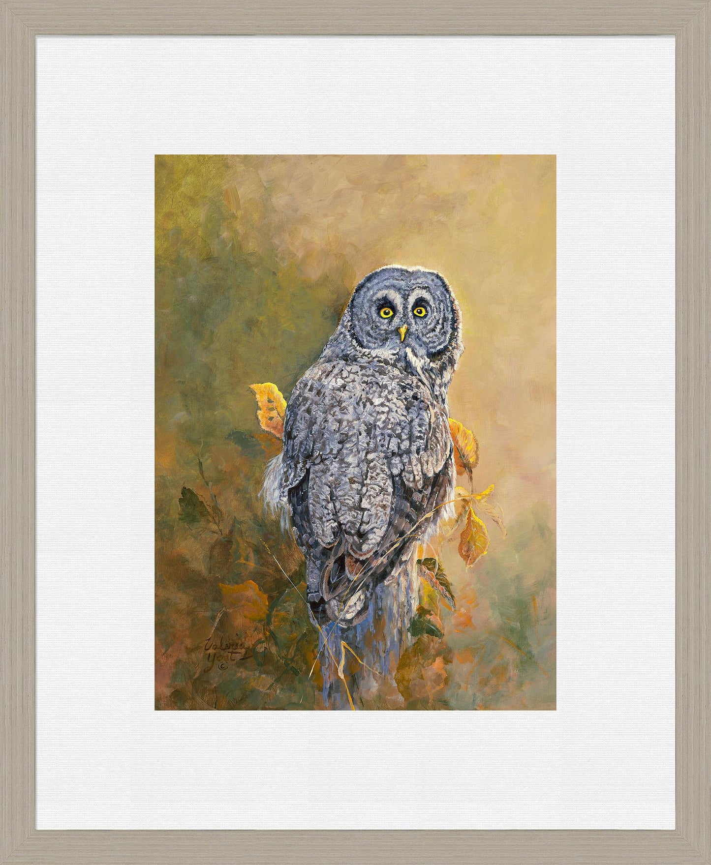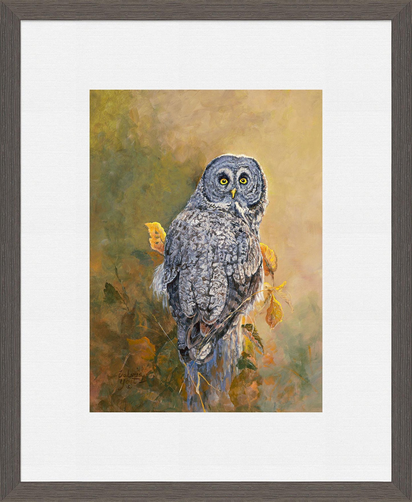Framed, limited edition of 250 signed and numbered art prints of a gray owl on an autumn branch. Published exclusively by Wild Wings. Print size is 13"W x 18"H. Choice frame size is 23"W x 28"H. Contemporary frame size is 23.5"W x 28.5"H.