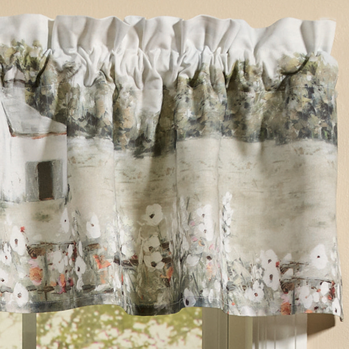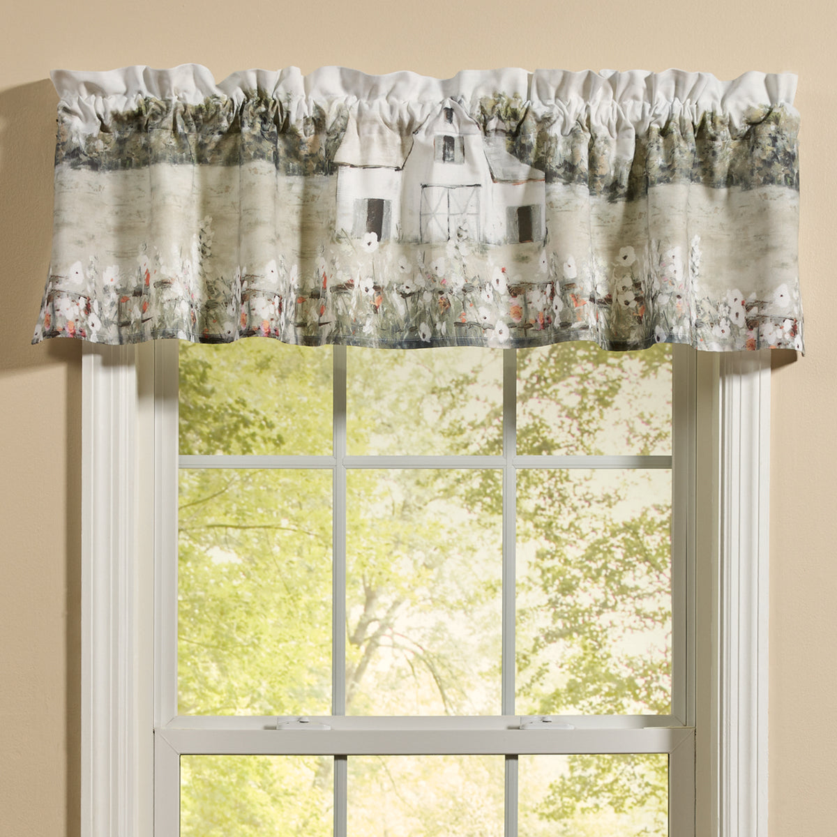 Bring a peaceful, rustic touch to your windows with The Good Life Valance. Crafted from soft white fabric, this valance features a lovely watercolor print of a classic white barn, surrounded by lush trees, with a charming fence with delicate white and red-orange flowers. Its serene country scene adds a warm, farmhouse-inspired atmosphere to any room. Measuring 14"L x 60"W, this valance is the perfect way to add timeless charm and cozy elegance to your home.