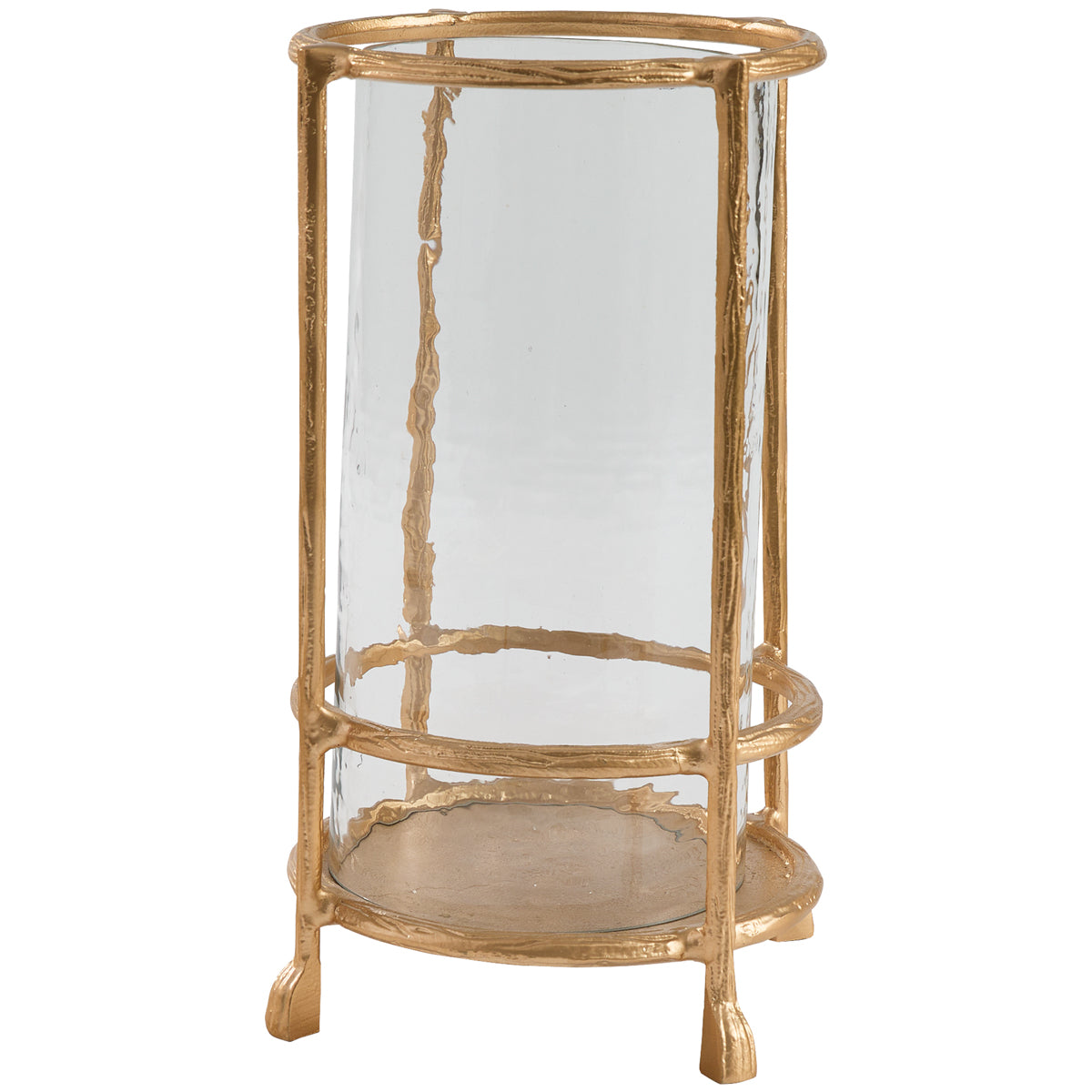 The Gold Bark Pillar Holder is a sophisticated and nature-inspired accent piece, designed in collaboration with Patricia Heaton Home. Crafted from metal with a rich gold finish, this pillar holder features a stunning bark texture, adding organic elegance to any space. It includes a beveled glass insert, providing a refined touch while protecting the candle within. Measuring 13.25"H X 8.75"W X 8.75"D, it is perfect for holding pillar candles and creating a warm, inviting ambiance. Whether used as a centerpiece or decorative accent, this pillar holder brings a touch of luxury and timeless charm to your home.