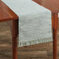 The Basket Weave Table Runner - Barely Blue brings a subtle elegance to any dining space. Woven from high-quality cotton yarn, its classic basket weave pattern enhances texture and visual appeal. A soothing mix of green, hues of blue, and white creates a fresh, nature-inspired look. Measuring 13" x 54", this runner is perfect for both casual dining and special occasions, offering a refined touch to any table setting.