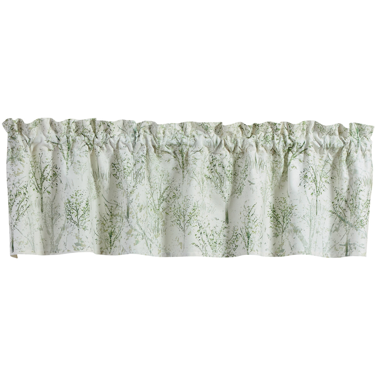 The Brookgreen Valance offers a serene touch to any window setting. Crafted from crisp white cotton and adorned with a delicate print, it depicts charming trees in various shades of gray, accentuated by lush green leaves. Measuring 14"L x 60"W, this valance brings a subtle yet captivating natural ambiance to your space.