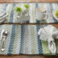 The Dew Drop Chindi Placemat Set of Four showcases a beautifully handcrafted design with a unique blend of texture and color. Made from cotton chindi rags that are hand-dyed in green, white, and shades of gray, each placemat carries a distinct, artisanal charm. Measuring 13" x 19", it offers a perfect balance of durability and style, making it an ideal addition to both casual and elegant table settings.