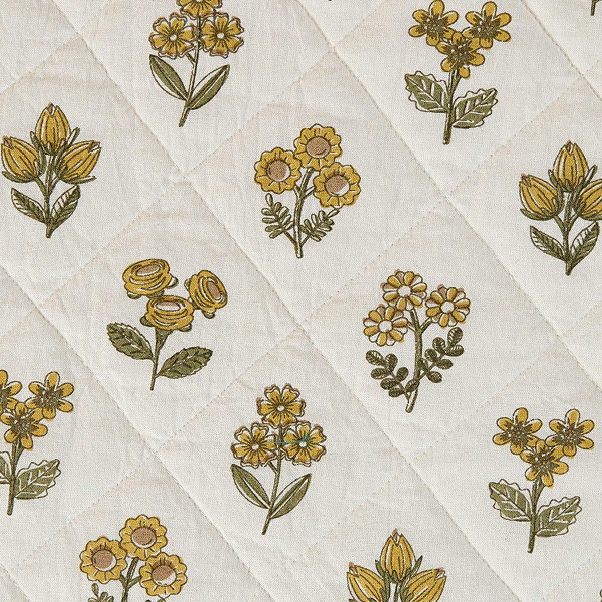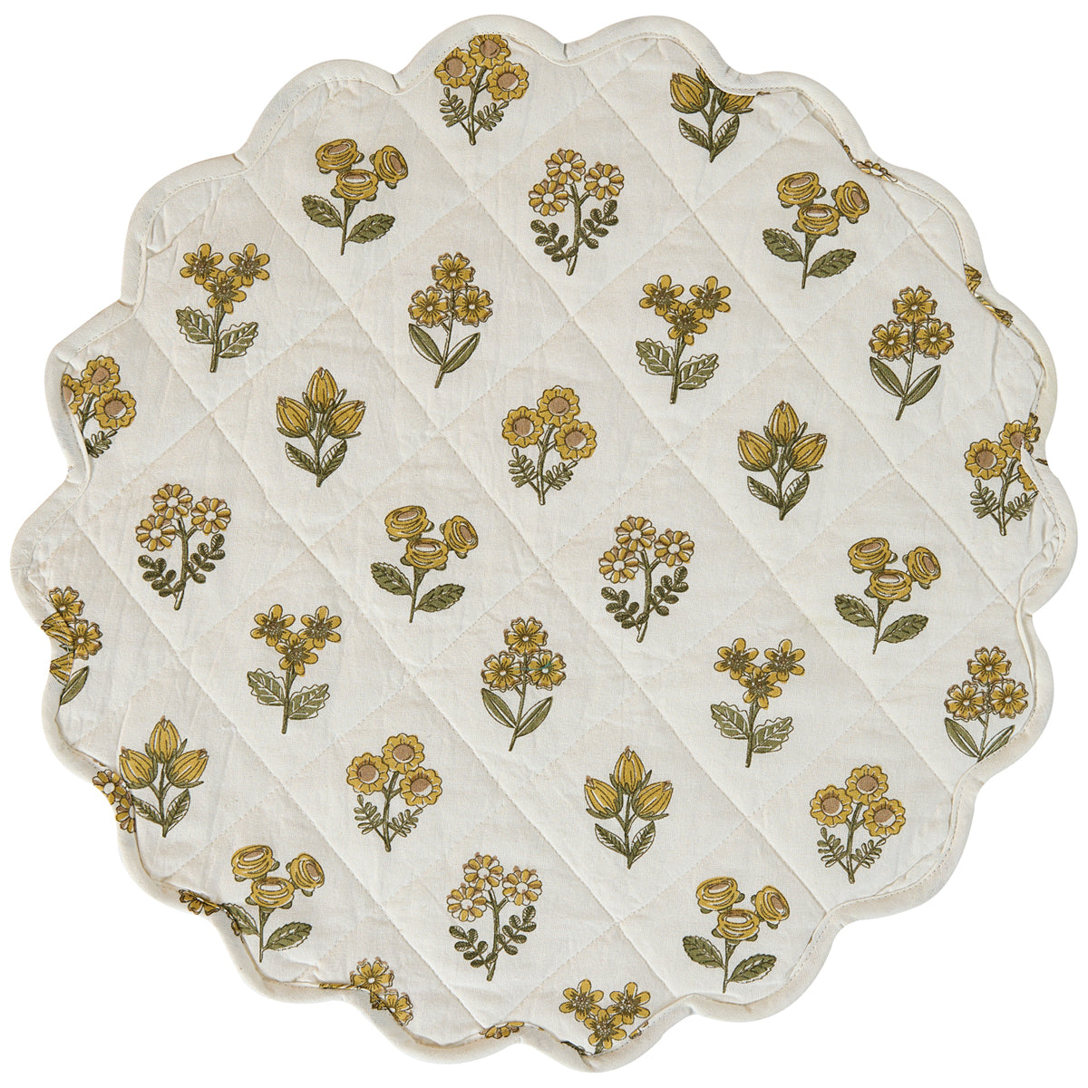 Enhance your dining table with the Golden Acres Placemat Set, featuring four elegantly crafted placemats made from soft cream-colored cotton fabric. Each round placemat measures 15 inches in diameter and showcases a charming quilted design with scalloped edges for a classic touch. Delicate yellow flowers with green stems are beautifully printed across the surface, adding a fresh and cheerful aesthetic to your table setting. Perfect for everyday use or special occasions, these placemats provide both style and functionality to protect your table while elevating your décor.