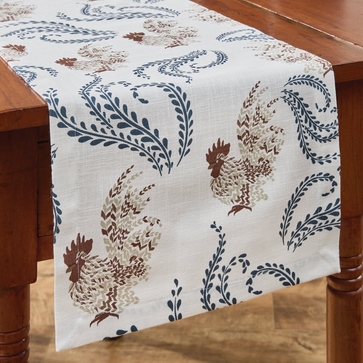 The Fancy Chickens Table Runner brings a playful yet rustic charm to your dining table. Crafted from soft white ground fabric, it features a lovely print of blue stems with tiny leaves and chickens in shades of cream and burnt red. Measuring 54 inches by 13 inches, this table runner is the perfect accent for creating a cozy, farmhouse-inspired atmosphere. Whether for casual meals or festive gatherings, it enhances your table with a charming country touch.