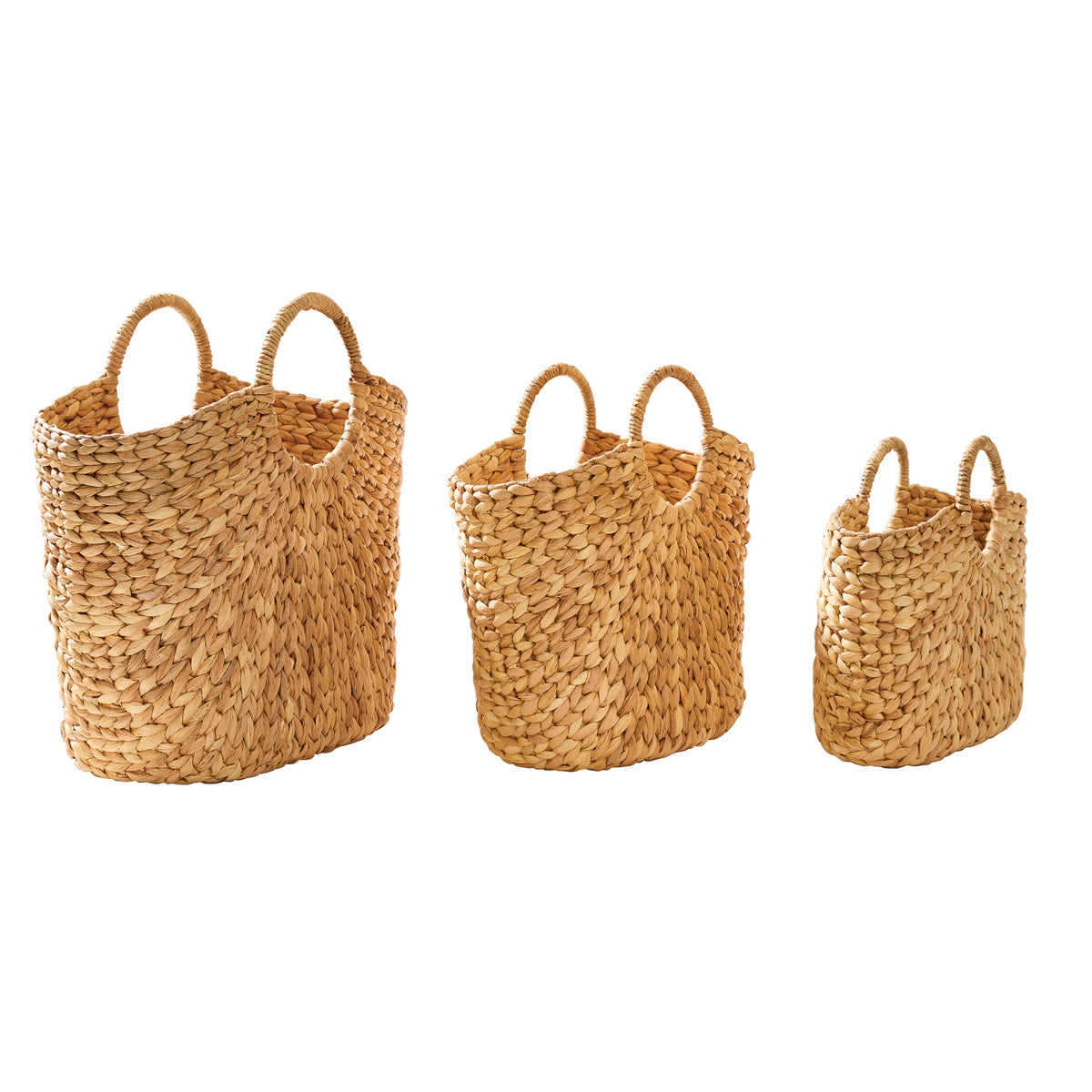 The Hyacinth Market Bag Set of 3 combines practicality and style, offering a natural, eco-friendly solution for storage and shopping. Made from durable hyacinth, each bag features a sturdy construction with a textured finish. The set includes three sizes: Large (17.25"H x 17"W x 9.75"D), Medium (14.5"H x 15"W x 6.5"D), and Small (12"H x 12.5"W x 4.75"D), perfect for organizing or carrying groceries, personal items, or other essentials. With their earthy tones and versatile designs, these bags bring a touch of rustic charm to any occasion.