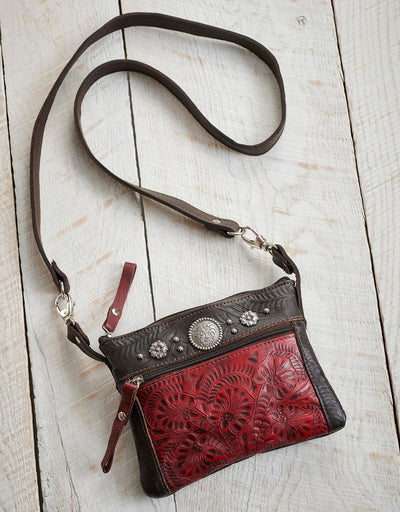 Versatility on the go! Adjustable and detachable shoulder strap goes from cross body style to worn on your belt loops in an instant. Zipper closure top plus front zipper and open back pocket. Artistic embellishments from rich crimson color, hand crafted hardware and hand tooled leather detailing. Handmade one at a time. 100% genuine leather. Imported.