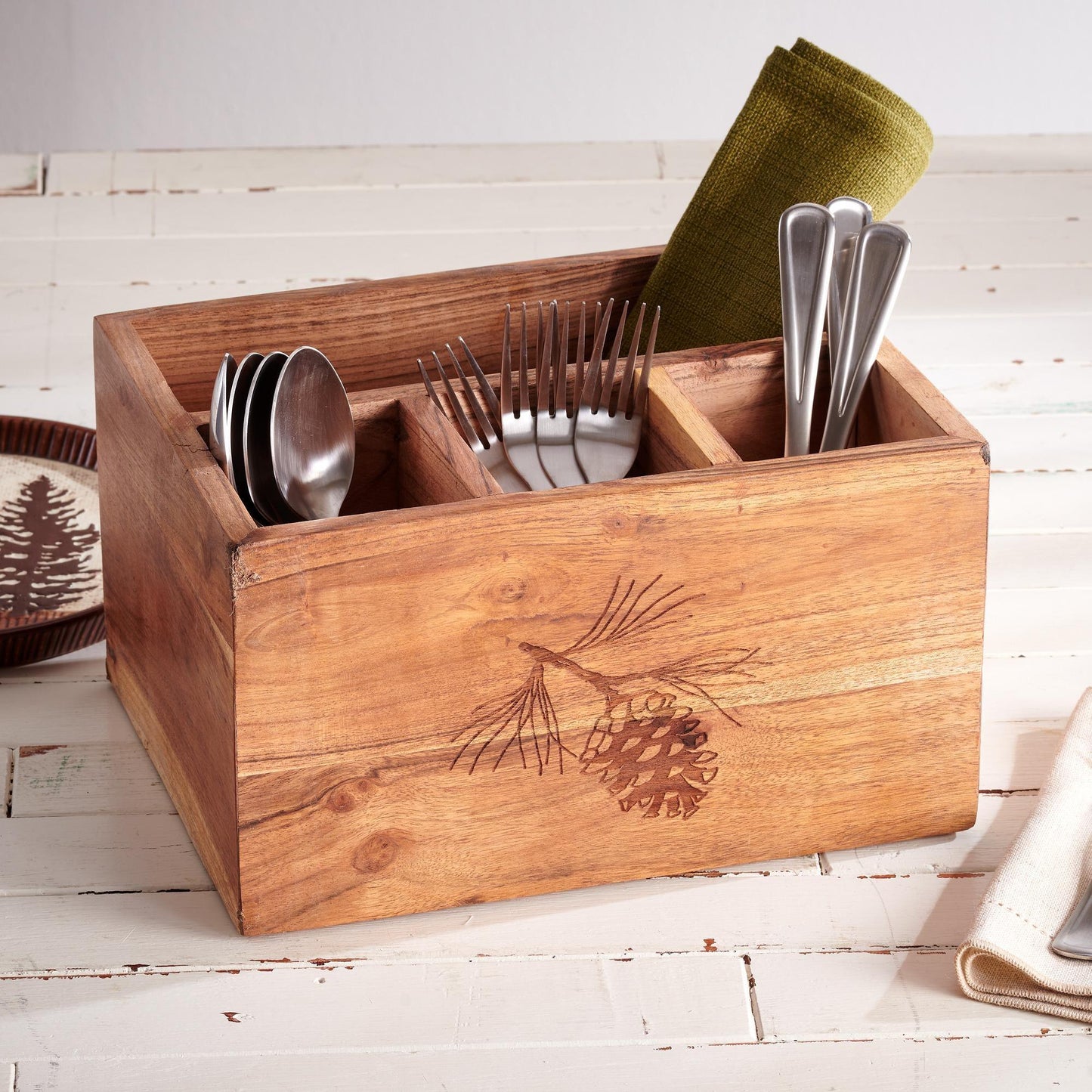You won't want to hide this utensil caddy! Entertain in style with wood caddy with laser-etched pinecones on one side and a bear with pinecones on the other. 5.75"H x 11"L x 8.5"D.