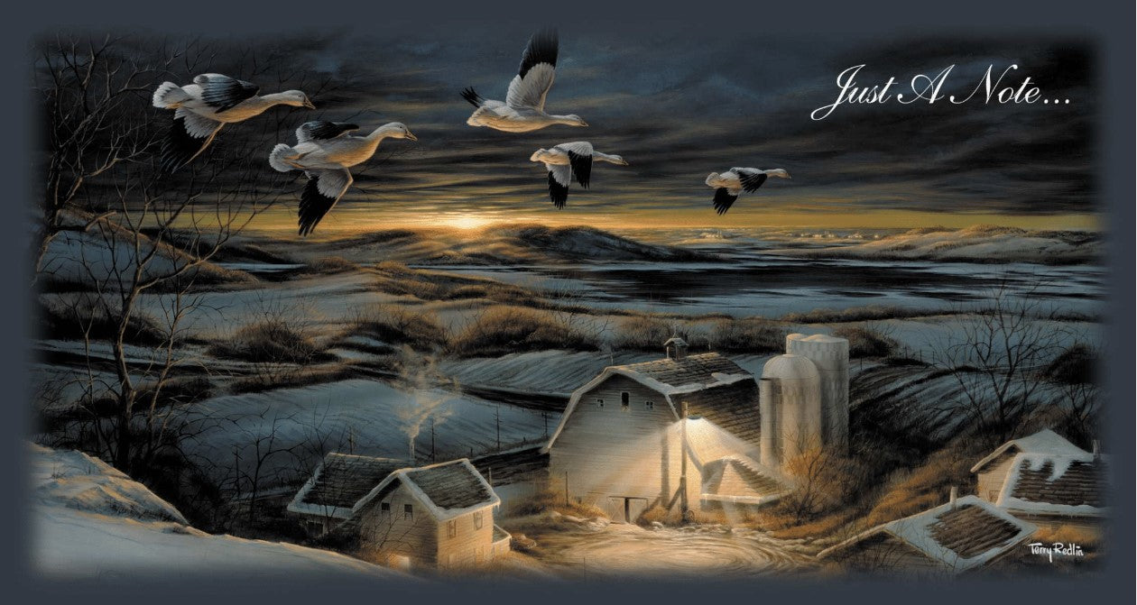 High quality note cards featuring the wildlife art of Terry Redlin. 12 cards, 13 envelopes. 4" x 7 1/2 ". Gift boxed. Blank inside. Made in the North America.