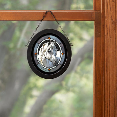 Let the light shine! New stained glass art hangings show their true colors when back-lit with natural sunlight. Popular designs are printed on glass with fade resistant inks and framed with 3/4" black-finished moulding. 9"H. Ready to hang with provided chain. Designed, printed, and assembled in North America.