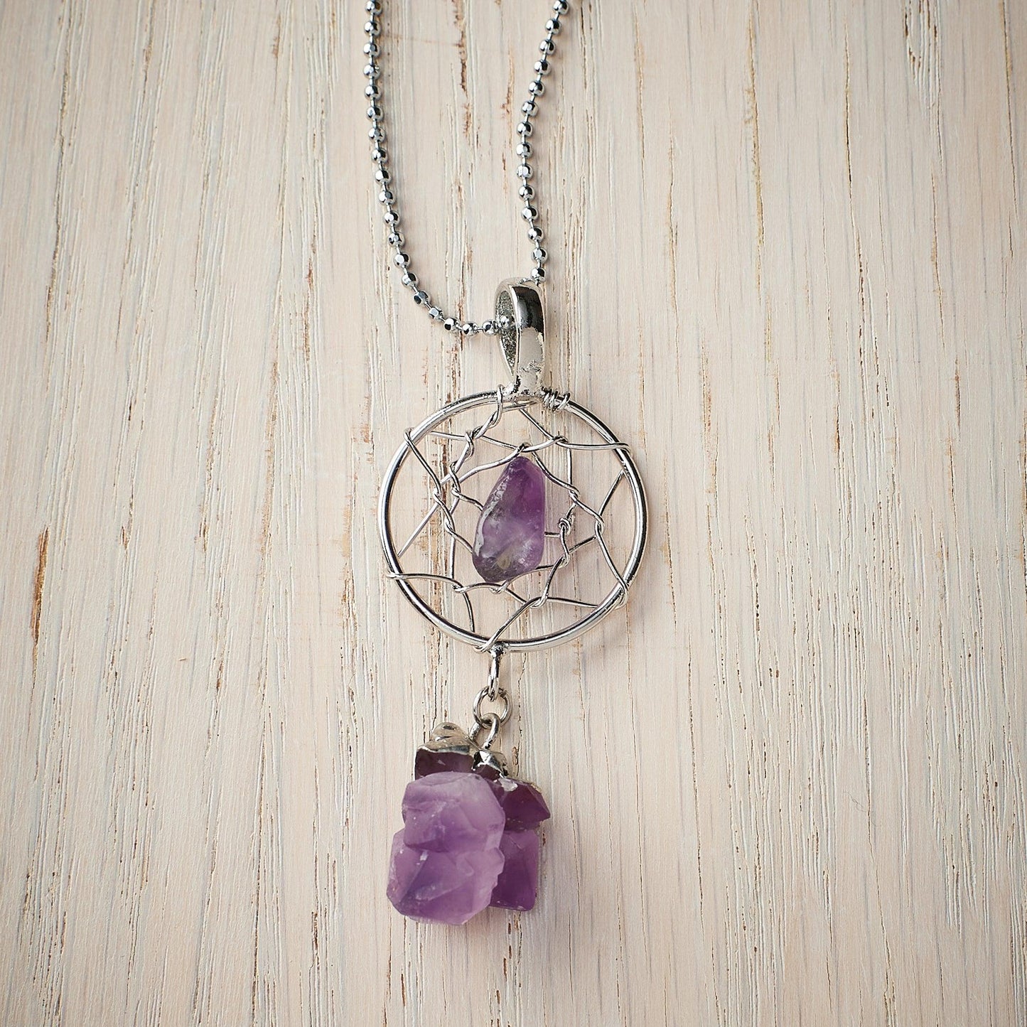 Filter out negativity with beautiful handmade dream catchers, available as necklaces or bracelets with natural stones. Amethyst promotes calming, citrine brings joy, sodalite boosts communication, black onyx offers protection, Indian agate supports wisdom, and howlite helps with patience. No two stones are exactly alike. Necklaces feature 18" chain with 2.25" drop dreamcatcher pendant and lobster claw closure.