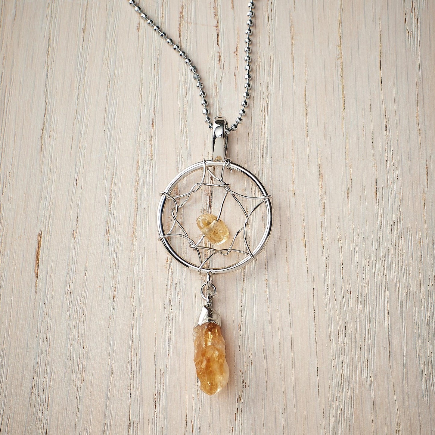 Filter out negativity with beautiful handmade dream catchers, available as necklaces or bracelets with natural stones. Amethyst promotes calming, citrine brings joy, sodalite boosts communication, black onyx offers protection, Indian agate supports wisdom, and howlite helps with patience. No two stones are exactly alike. Necklaces feature 18" chain with 2.25" drop dreamcatcher pendant and lobster claw closure.