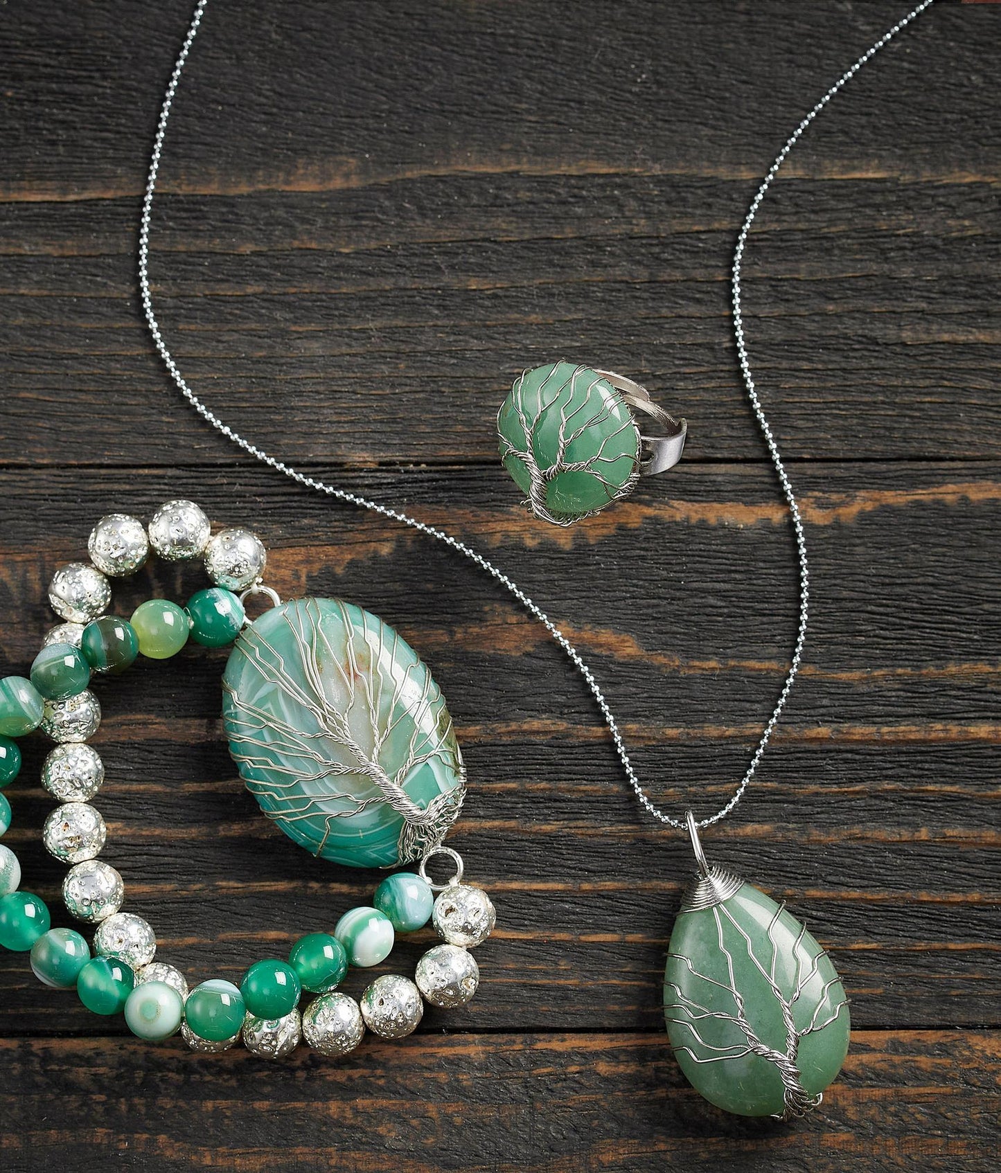 Fashioned with the iconic tree of life, each piece symbolizes the strength and beauty of a tree standing tall against rough conditions yet absorbing love and happiness like sunlight. 18" silver metal chain necklace features tree of life pattern in hand wrapped wire around teardrop shaped genuine Green Aventurine stones.