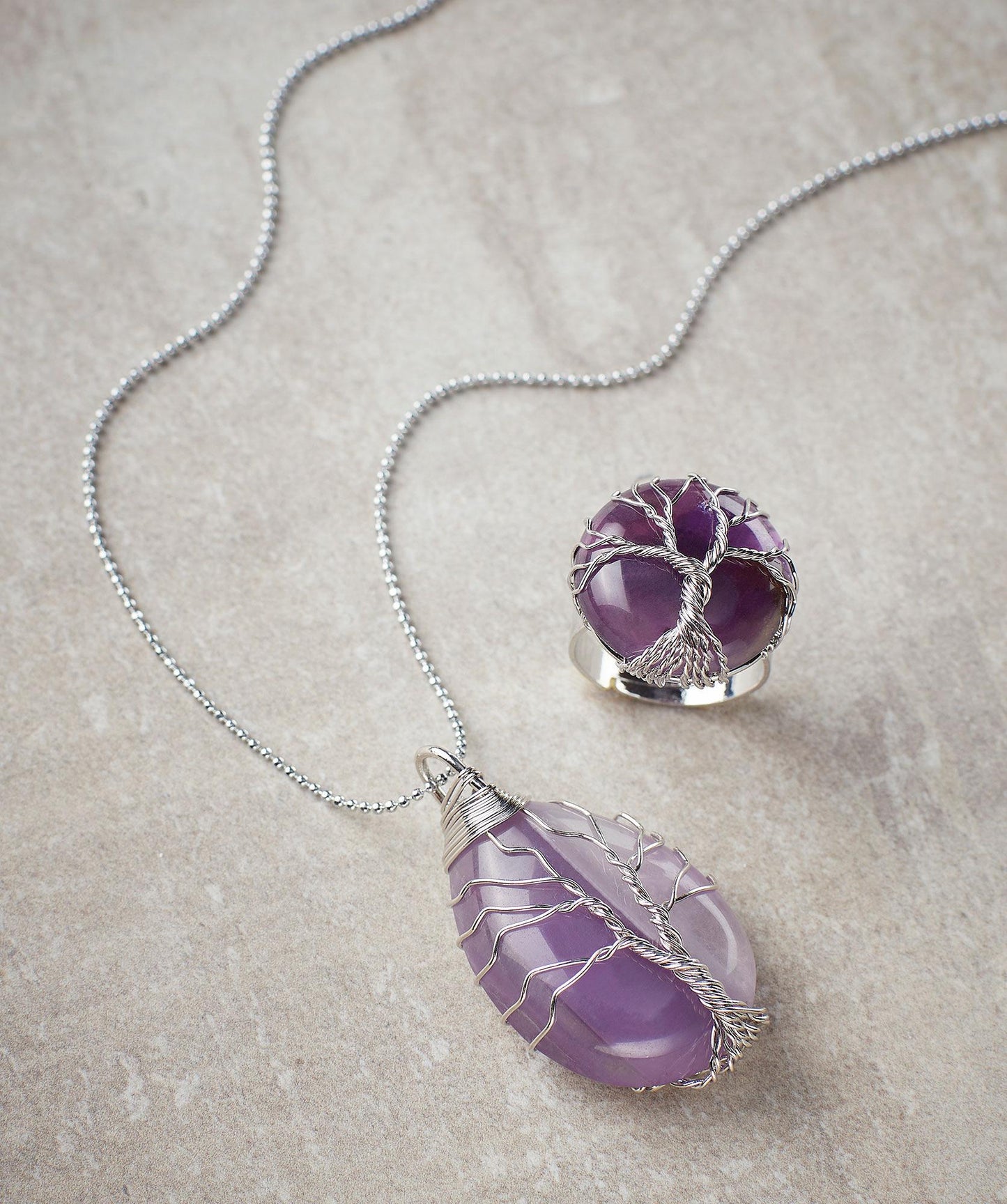 Fashioned with the iconic tree of life, each piece symbolizes the strength and beauty of a tree standing tall against rough conditions yet absorbing love and happiness like sunlight. 18" silver metal chain necklace features tree of life pattern in hand wrapped wire around teardrop shaped genuine lavender amethyst. Double strand bracelets feature silver dipped lava rack and genuine stones.