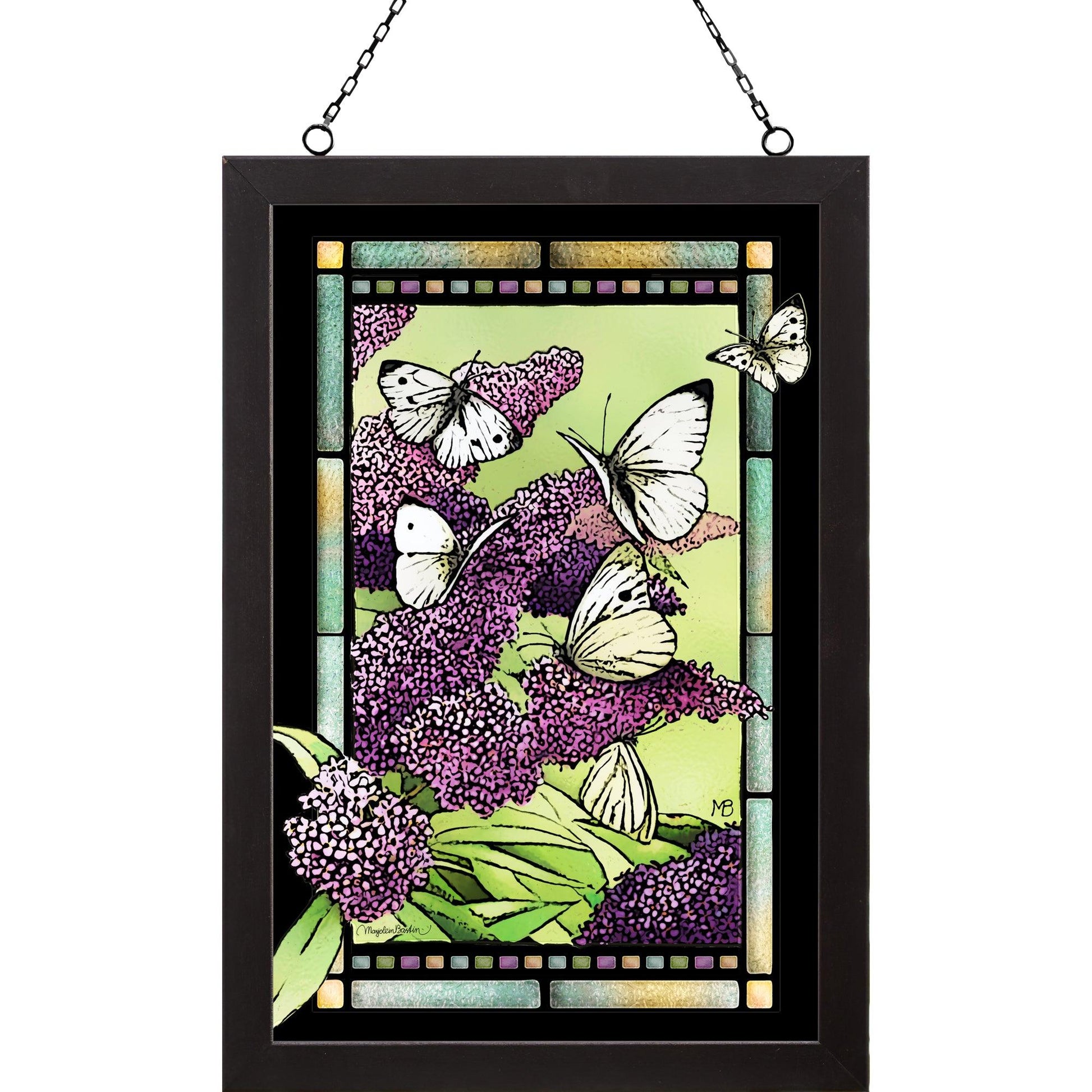 Let the light shine! Stained glass art hangings show their true colors when back-lit with natural sunlight. Popular designs are printed with fade resistant inks on 12" x 18" glass, framed with 1" black-finished moulding. Framed size 14" x 20". Ready to hang with provided chain. Designed, printed, and assembled in USA.