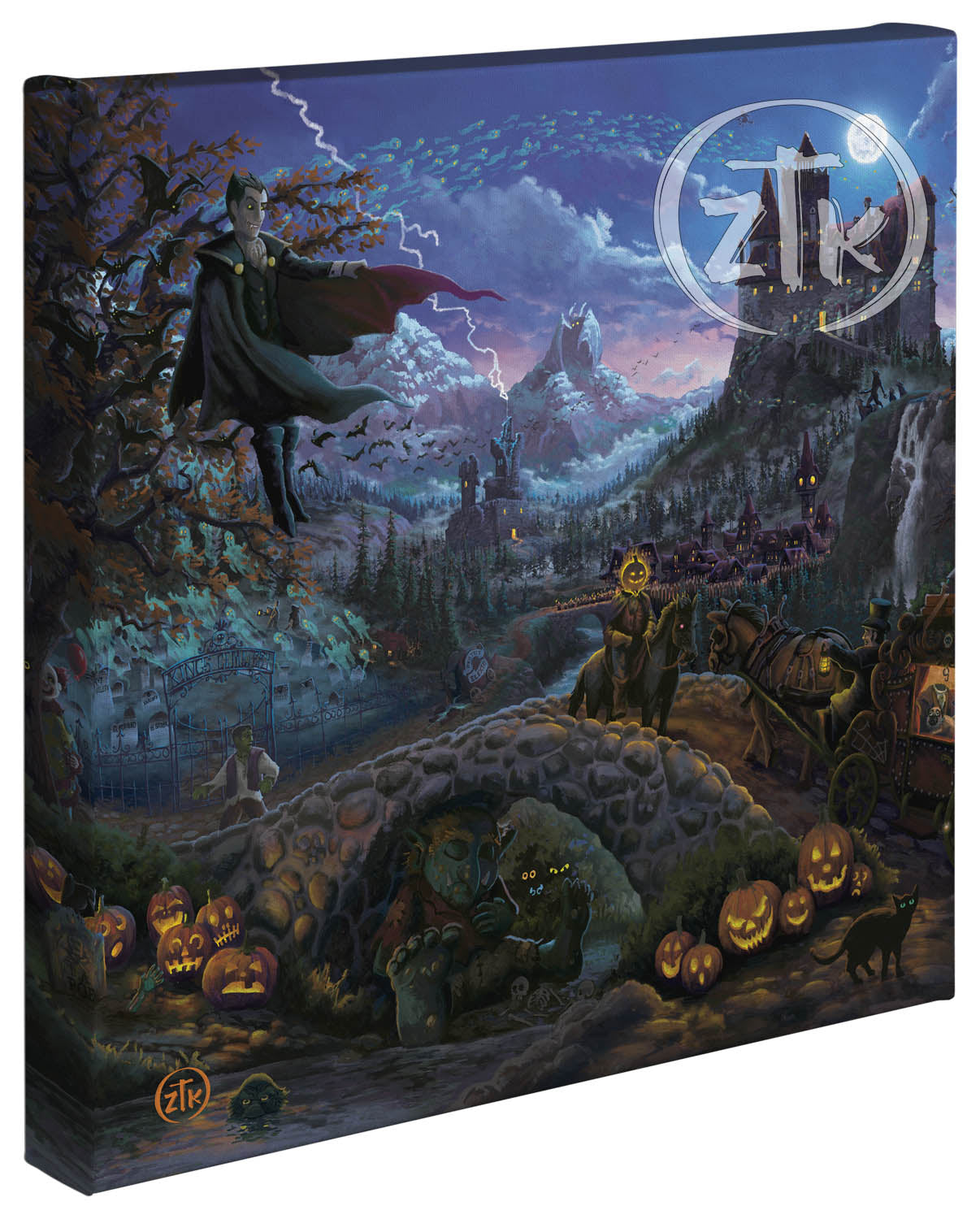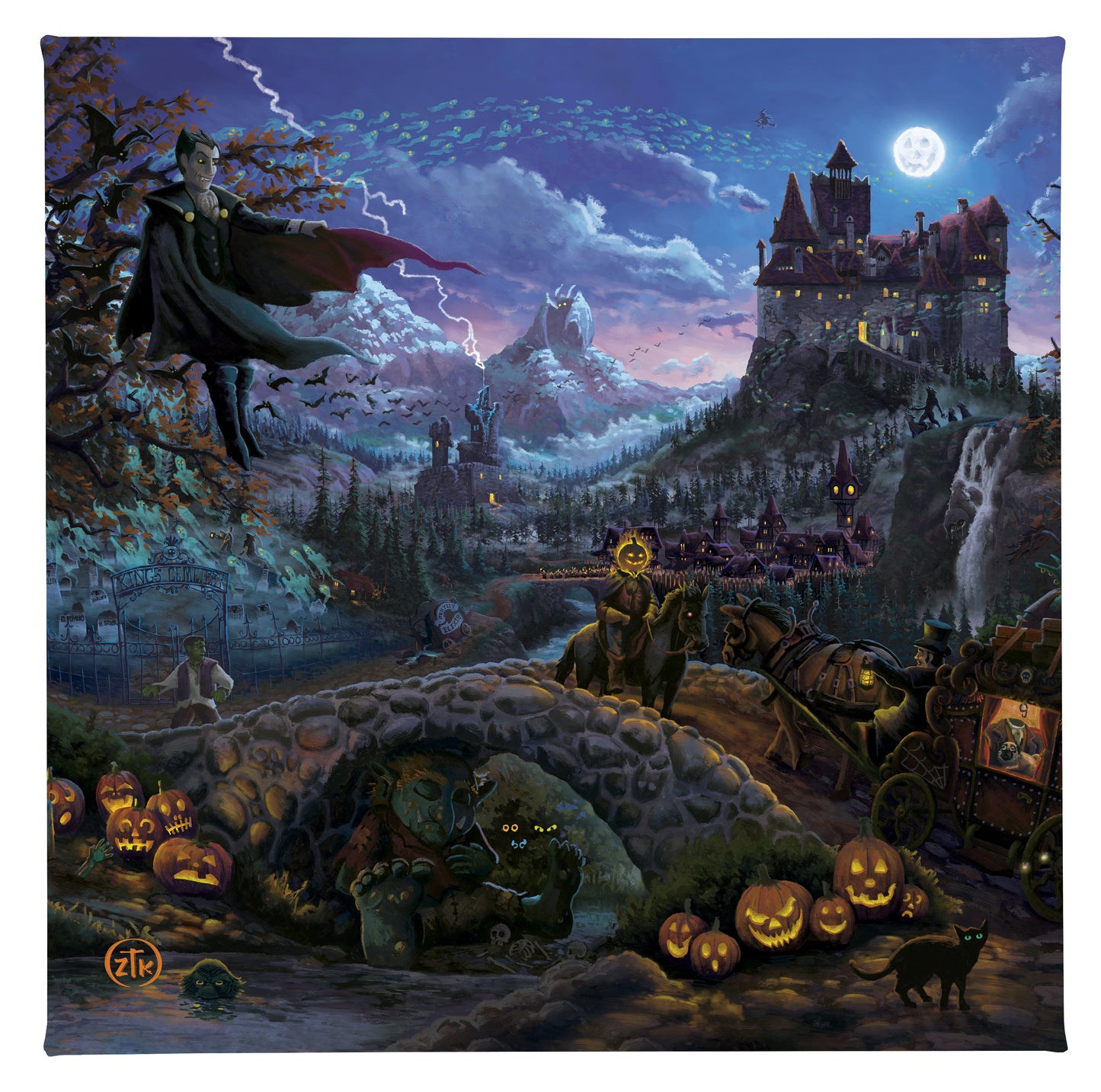 I have always enjoyed Halloween. Growing up, the fanciful and frivolous imagining of ghosts, ghouls, and things that go bump in the night was a source of immense family fun. My mother would make my brothers and me wonderful costumes to wear and we would go to our church’s “Trunk or Treat”’ or the local “Boo at the Zoo” to gather holiday candy before we even started making the rounds to our neighborhood houses. It is fond memories like these that led me to create my latest work. “Transylvania” is the first in my “Worlds of Wonder” series and a homage to all the great monsters of my childhood Halloween frights. Dracula, Frankenstein, the Werewolf and the Mummy dominate a landscape filled with castles, haunted forests, spooky graveyards and a gathering of villagers ready to rid the land of any troublesome beasties. Beyond these, many more references to our collective popular cultural can be found on this canvas. I think you will all enjoy finding the many creatures who pervade the ghostly scenery and discovering who lies resting in “King’s” graveyard. One small detail of personal note that I want all to see is our family dog; “Poe” a nervous pug that barks a good game but who ultimately stands behind us peeking out while protecting our house from assorted Halloween visitors. He sits in the carriage on the Invisible Man’s lap with a wide-eyed peer at everything happening outside. Transylvania begs for exploration by anyone who is stout of heart and of good humor. And, as always, I want to thank you all for sharing my adventure in art…if you dare.