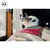 Black and white cat tensely crouched on the back of a sofa and intently staring out of a window