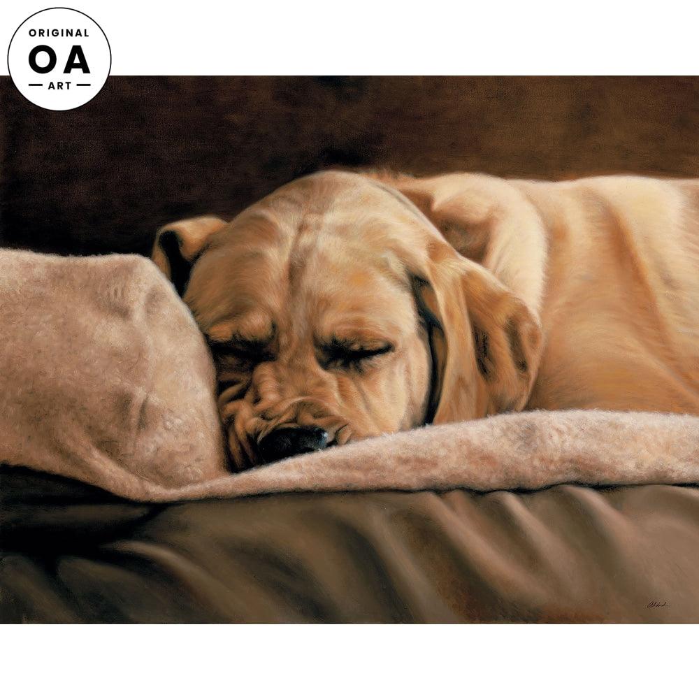 A Yellow Lab is fast asleep with his nose scrunched up in his pillow.
