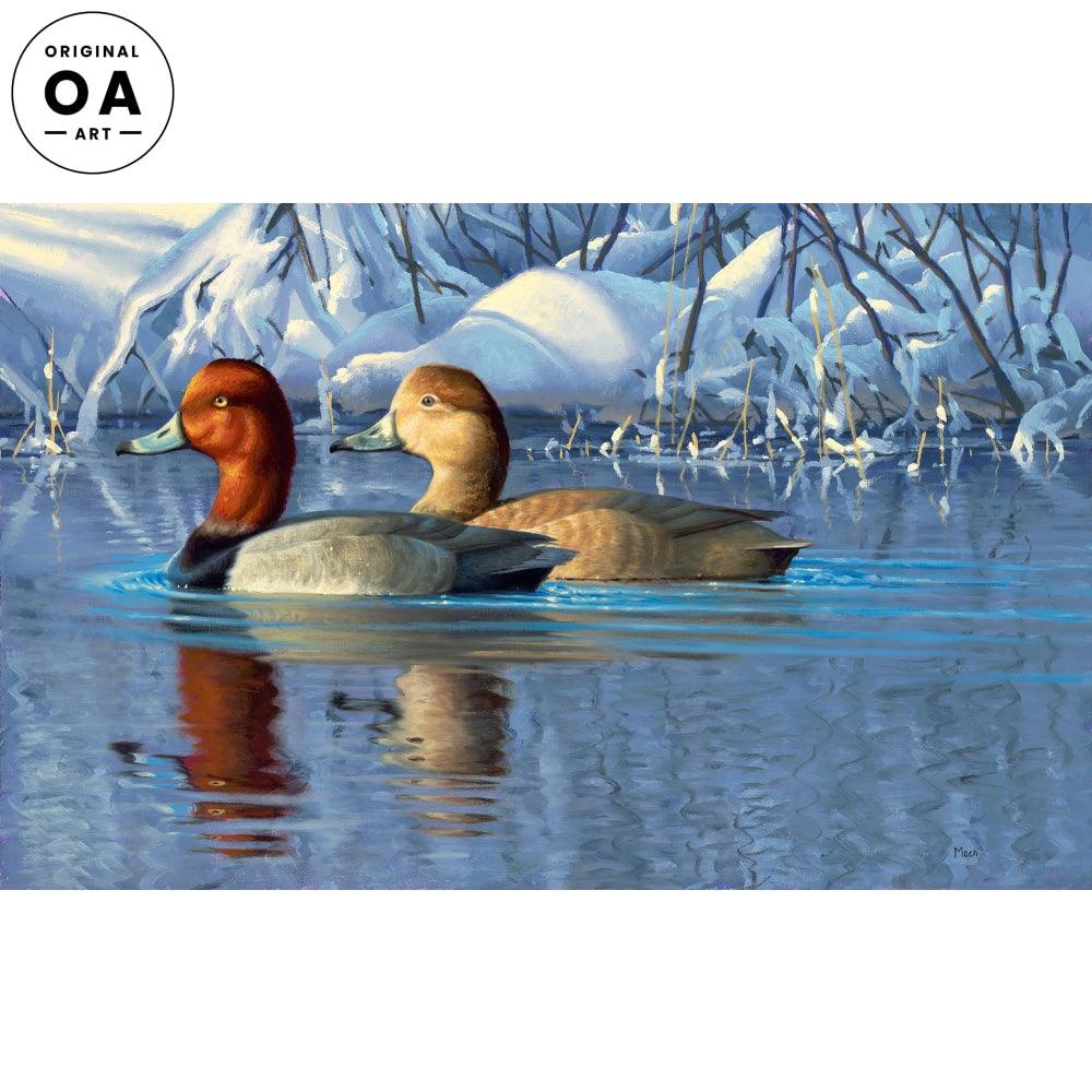 Original oil painting by Tom Moen depicting two redhead ducks swimming in the lake on a sunny winter day. Image size: 13-1/2" x 22".
