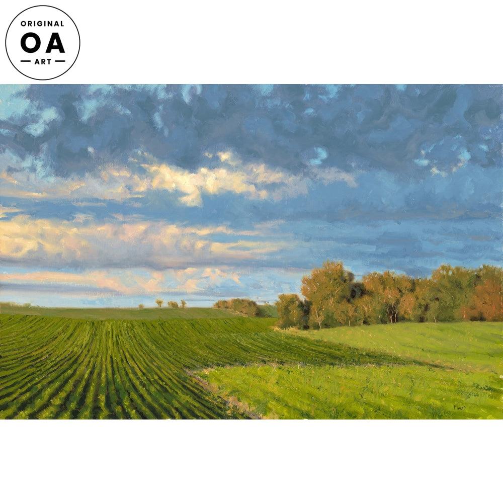 This painting depicts a farm landscape as one might see traveling down a country road.