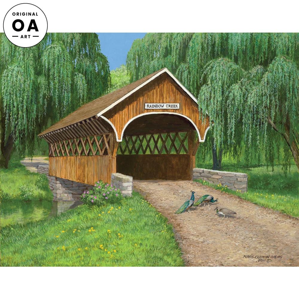 Original acrylic painting by Persis Clayton Weirs depicting three peacocks in front of a nostalgic covered bridge under overhanging willow trees. Image size, 11" x 14".