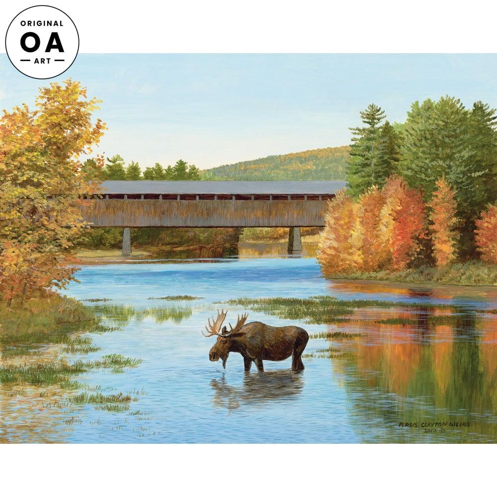 Original acrylic painting by Persis Clayton Weirs dipicting a moose standing in a lazy river with a cover bridge in the background. Image size;11" x 14".