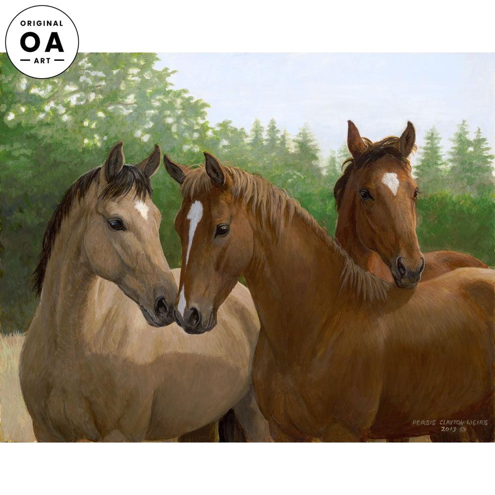 Original acrylic painting by Persis Clayton Weirs depicting a trio of two year old horses. Image size; 11" x 14".