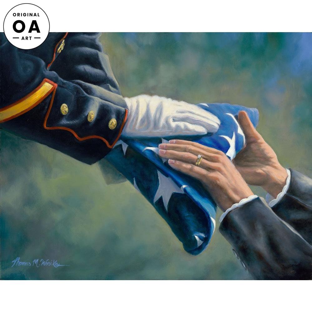 Original oil painting by Tom Wosika depicting the hand off of the American flag from a Marine to a loved one. Image size; 16" x 20".