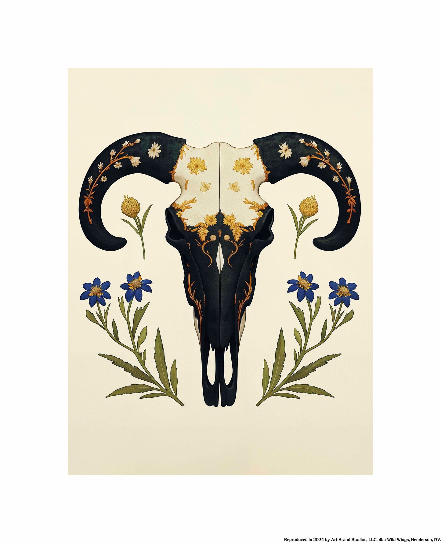 The skull itself is accented with rich golden-yellow botanical details, giving it an almost regal presence, as if it has been a silent observer to the passage of time. Surrounding the skull are soft yellow thistles and vivid blue wildflowers, with their stems and leaves creating a gentle frame around the central figure. These flowers are emblematic of resilience, flourishing in the rugged desert terrain where life and death intertwine.