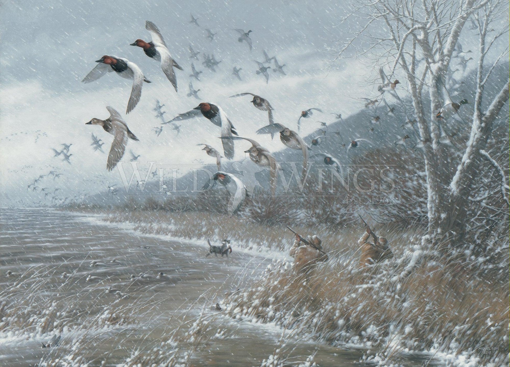 Limited edition of 750 signed and numbered art prints made from the original oil painting depicting the the tragic day when hundreds of duck hunters died in a sudden blizzard that took place on Armistice Day (November 11, 1940) in the upper Mississippi River valley. Image size, 18" x 25". Published exclusively by Wild Wings.