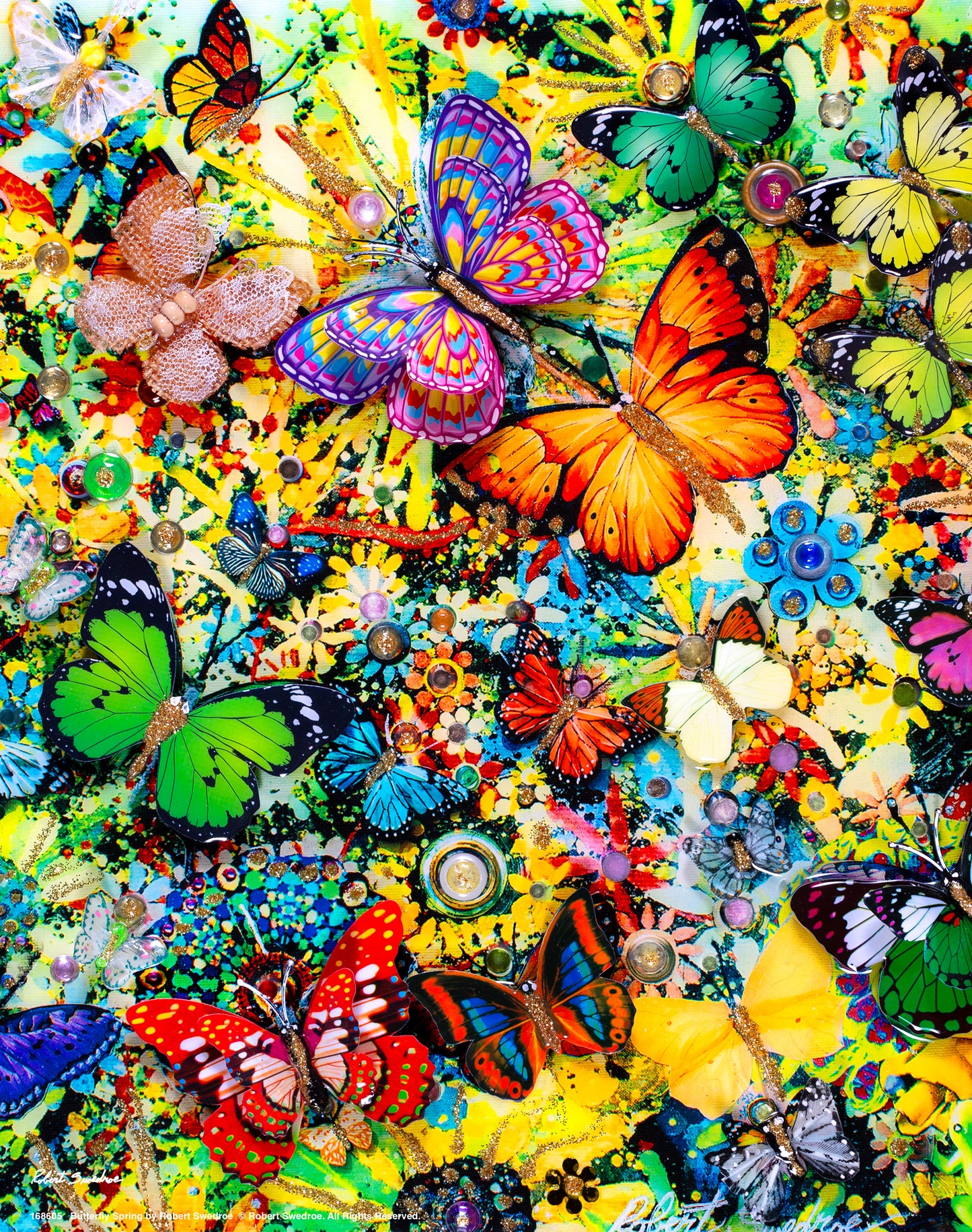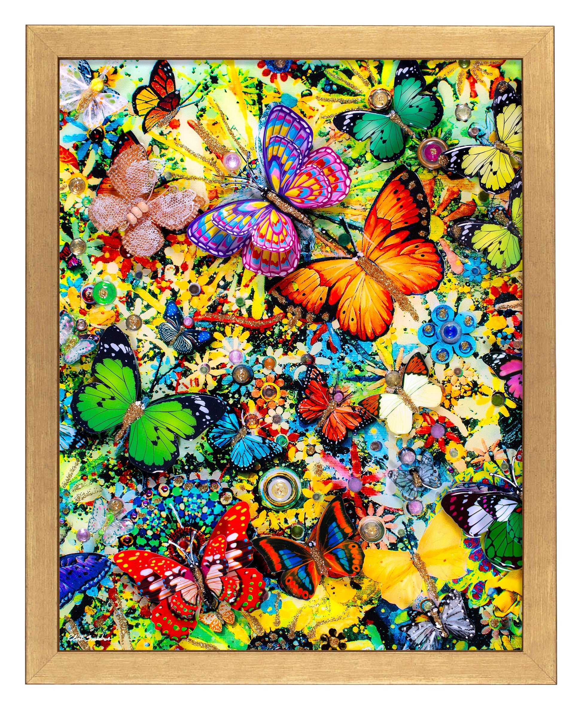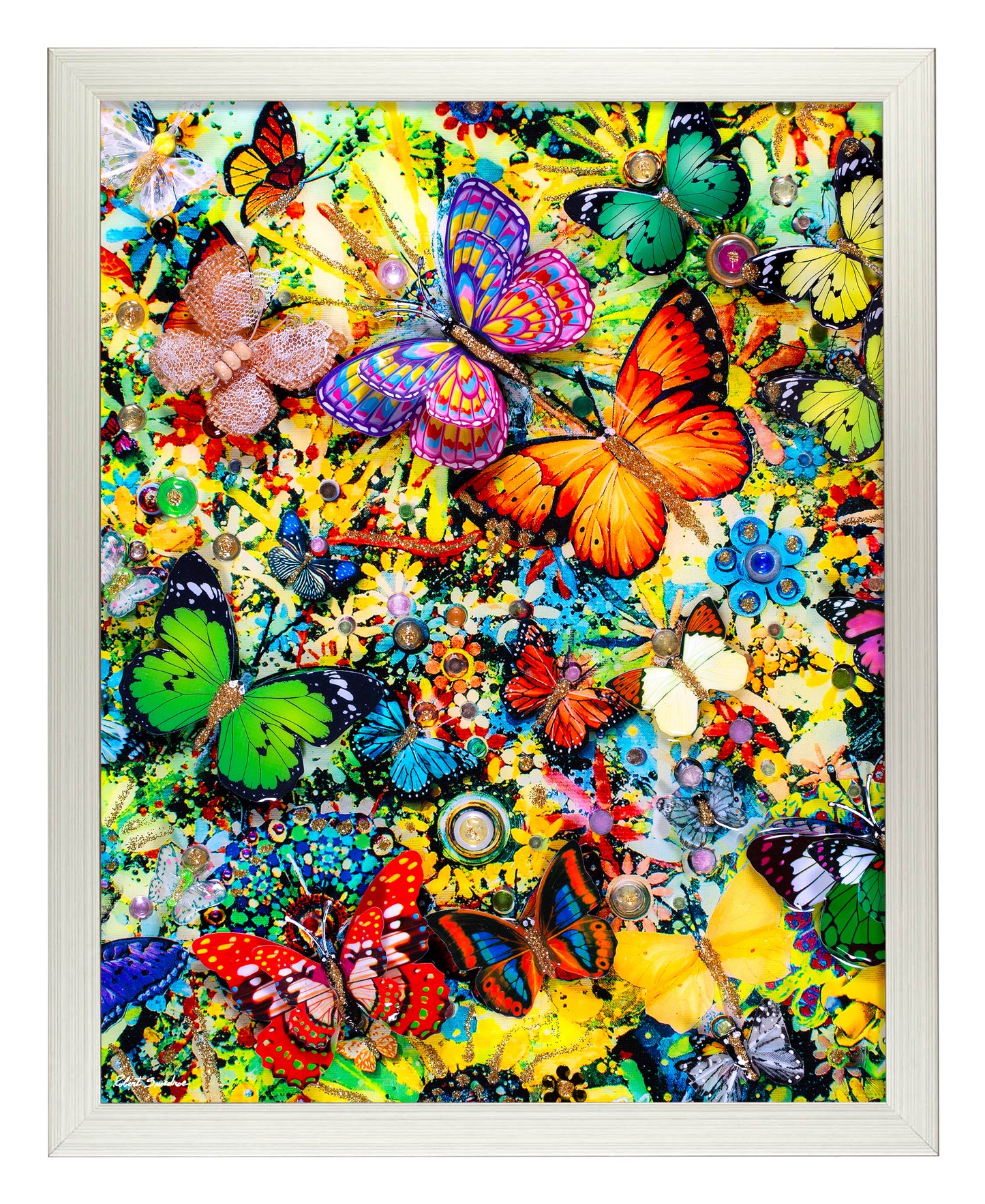 "Butterfly Spring," a vibrant addition to my Butterfly Narrative Series of collages. As an architect and collage artist, I've always been captivated by the beauty of transformation, and this artwork is a joyful celebration of the blossoming energy of spring. Crafted with a medley of three-dimensional glass and paper butterflies, faux pearls, beads, glitter, paint, and circle cut-outs, "Butterfly Spring" invites you into a world where spring colors burst forth in glorious harmony. Each element has been carefully selected and placed to create a dynamic tapestry that evokes the vitality and renewal of the season. Set against a backdrop of budding flowers, "Butterfly Spring" exudes a sense of vibrancy and life. The thoughtfully positioned and stacked three-dimensional butterflies appear to flutter with a sense of movement and grace, mirroring the dance of life found in nature's cycle. The layers of mixed media interact to create an experience of depth and joy, much like the layers of growth and transformation that spring brings. The high-gloss resin finish adds an element of radiance, enhancing the collage's overall vibrancy while echoing the glistening of dew-kissed petals in the morning sun. "Butterfly Spring" is an invitation to embrace the season's rejuvenation and celebrate the beauty that emerges from change. It's a tribute to the delicate yet resilient nature of butterflies—a symbol of hope, growth, and the potential for new beginnings. Mounted on canvas, this collage is a testament to the artistic representation of the life cycle. It captures the essence of spring's boundless energy and invites viewers to reflect on nature's transformative power. As you engage with "Butterfly Spring," I hope you find a moment of connection to the vitality of the season and a sense of wonder for the beauty that emerges from transformation. May this artwork inspire you to embrace the cycles of life and revel in the joy that accompanies growth and renewal.