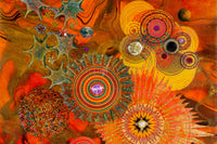 When it comes to creating collage art, I approach it in a surreal way. I don't like to dictate what the viewer is supposed to see. Instead, I aim to draw them in and encourage them to discover new things each time they view the piece. One of my works, Cosmic Energy from 2010, is a part of the Celestial Series. This piece captures the intense energy of planets and stars colliding in space. The primary color is red, with various shades of yellow and orange creating a fiery atmosphere. I used jewel-encrusted discs and circular shapes to represent the planets colliding with glitter-embossed stars set against a black and red background. The result is a truly out-of-this-world collage that captures the essence of a cosmic firestorm.
