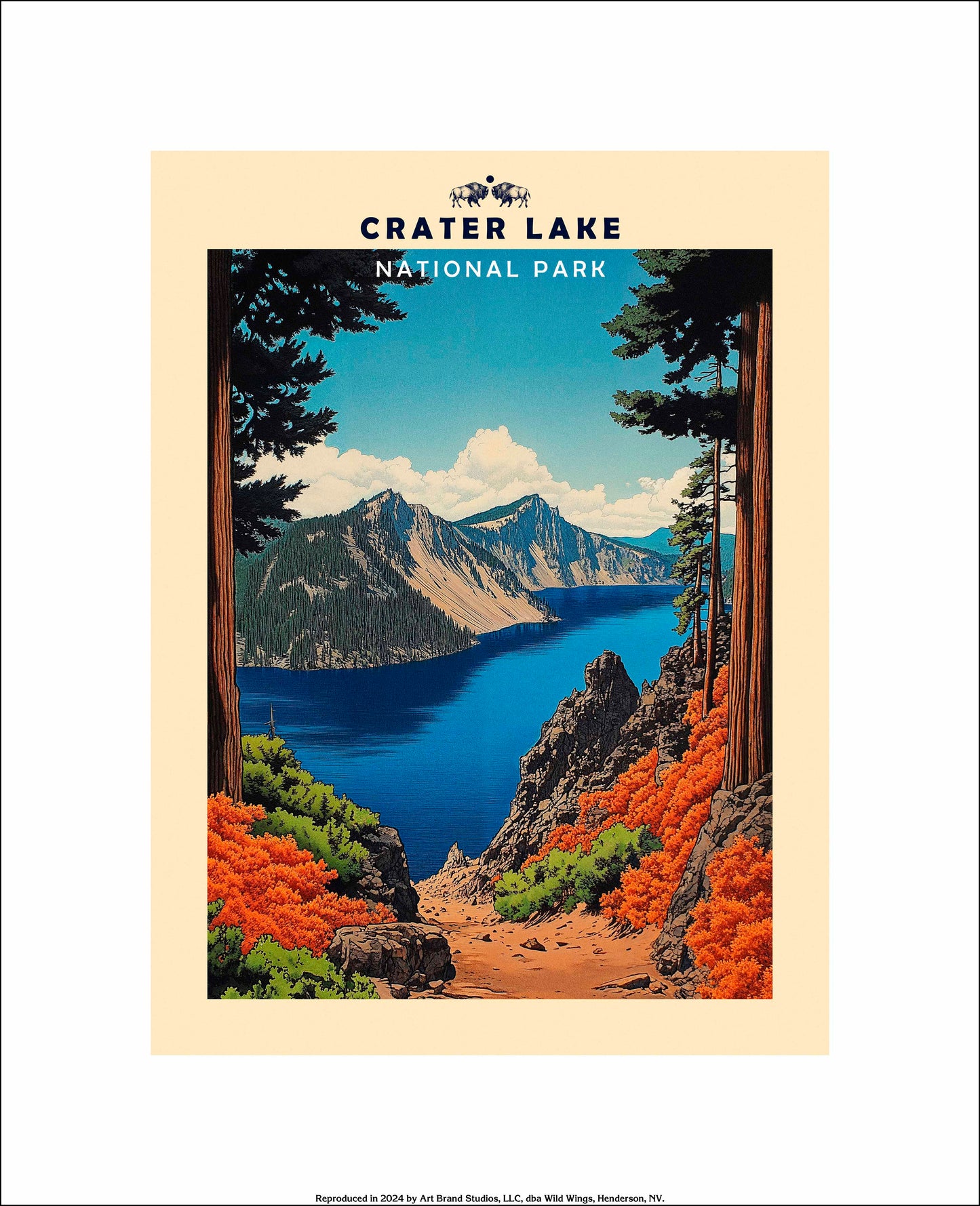 This vintage-style poster art of Crater Lake National Park beautifully captures the park's iconic landscape. The composition frames the deep blue waters of Crater Lake through a natural window of evergreen trees, creating a sense of discovery. The lake's intense azure color contrasts sharply with the rugged, rocky shoreline and the distant mountains. Vibrant autumn foliage in bright orange and green adds warmth to the foreground, balancing the cool tones of the water and sky.