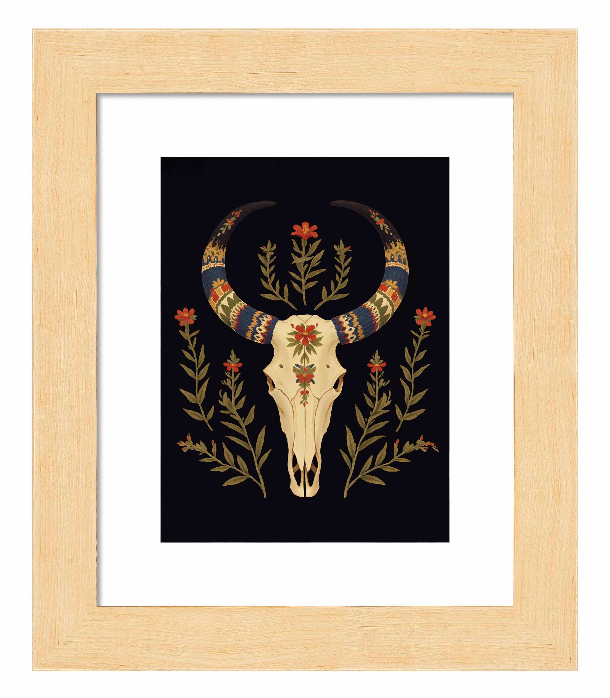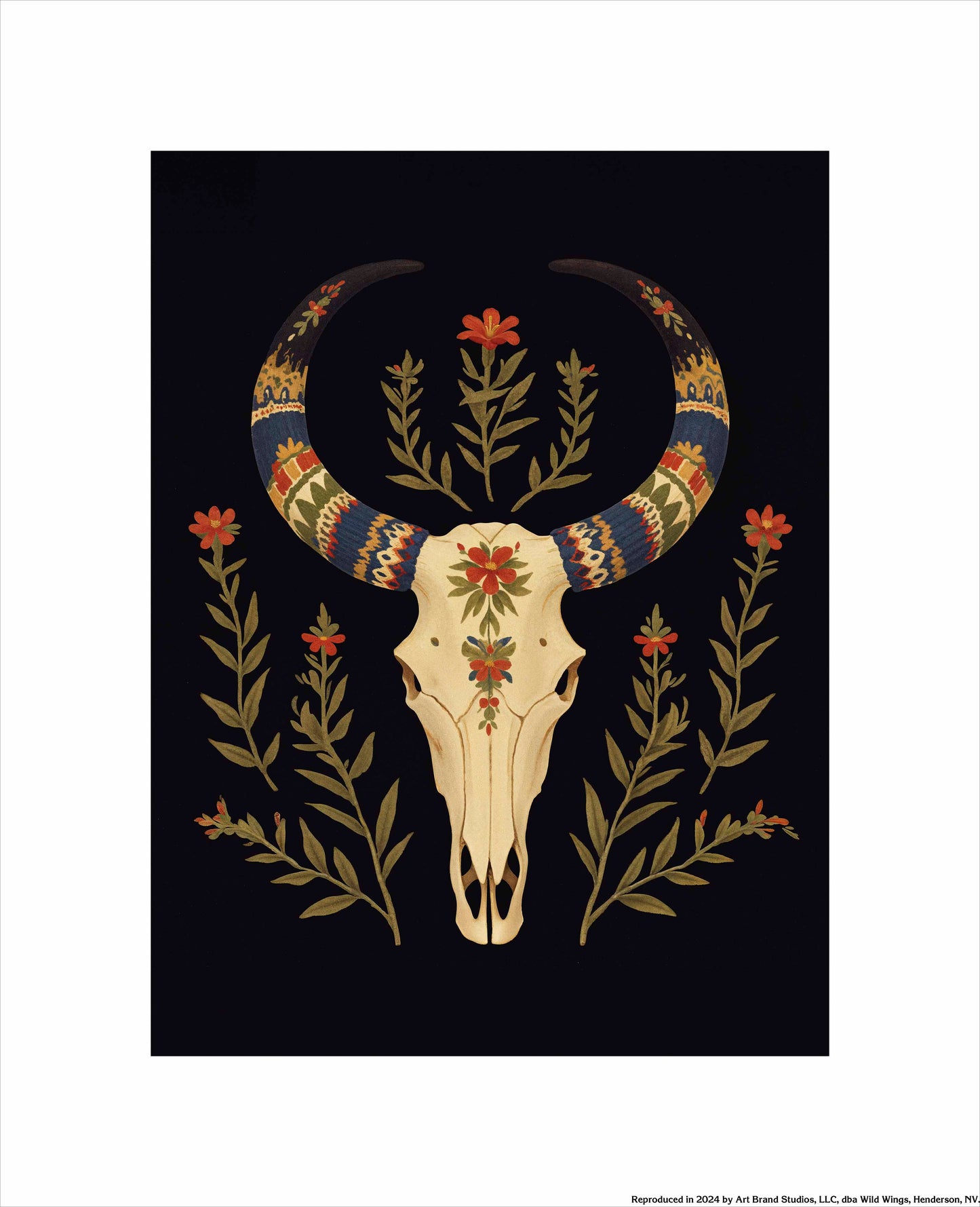 "Desert Sentinel" is a powerful depiction of Western resilience, blending the strength of nature with the spirit of the American Southwest. The centerpiece of this artwork is a beautifully detailed cow skull, its smooth cream tones standing in stark contrast to the deep black background. The skull is intricately adorned with vibrant patterns along its horns, which are painted in bold shades of blue, red, gold, and cream, evoking traditional Southwestern textile designs. These vivid patterns give the horns a regal and protective quality, transforming the skull into a guardian-like figure watching over the desert landscape.