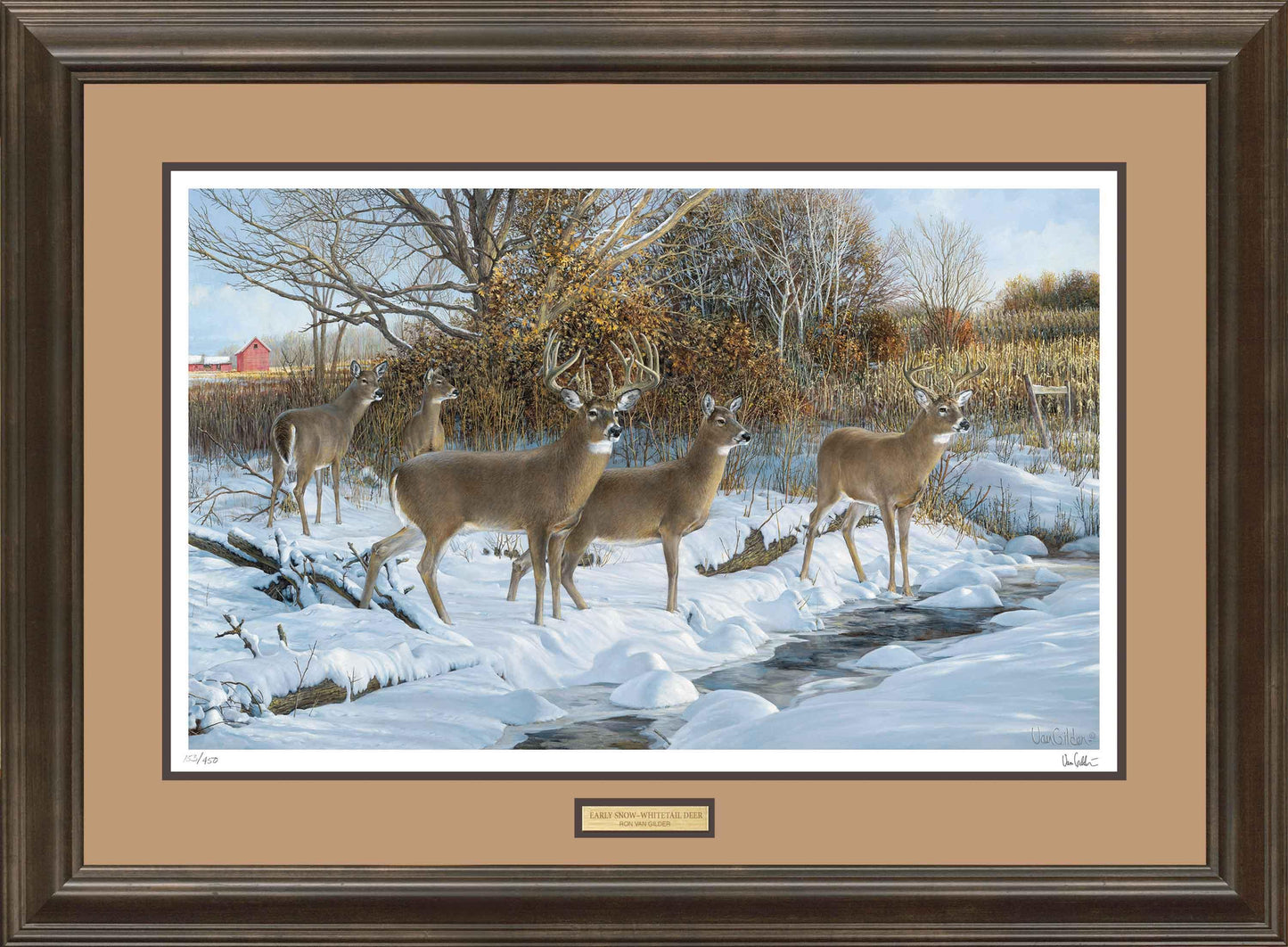 Limited edition of 450 signed and numbered prints. Image size, 16" x 26". Framed size, 27" x 36-3/4" with 2-3/8" espresso walnut-finished moulding. Double matting with Pear outer mat and brass nameplate. Published exclusively by Wild Wings.